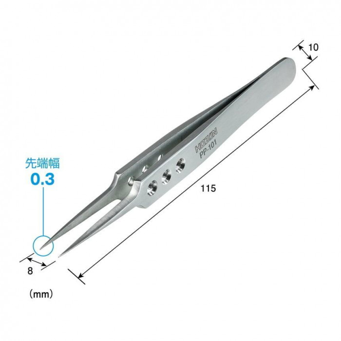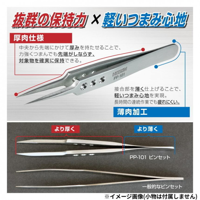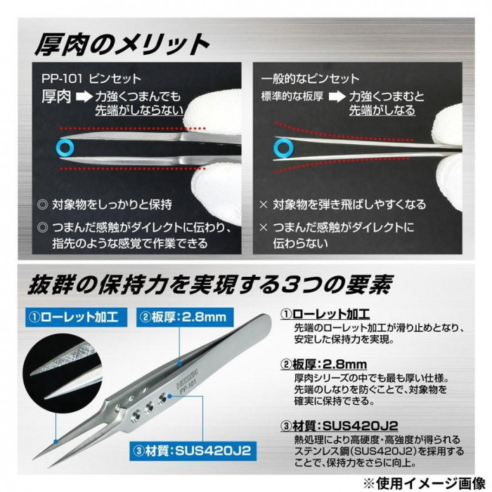 | 強力型ピンセットのハイグレードシリーズ。先端ローレット付きで、保持力を強化。熱処理を施した強靭な素材を使用し、先端まで厚みを残すことで過酷な使用でも曲がりにくい強度を実現。プライヤーのように強くつかんでこじる作業も行えます。 |