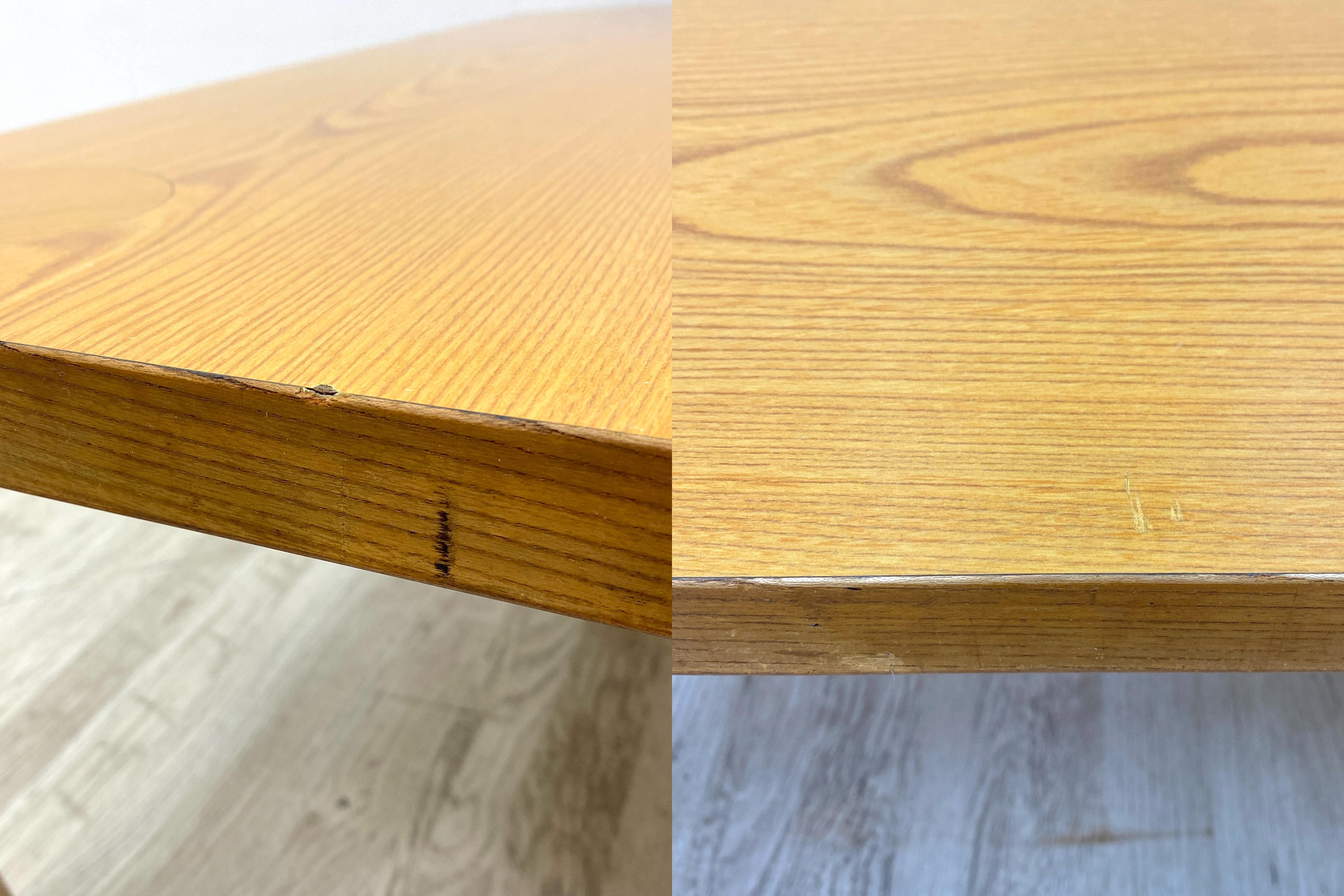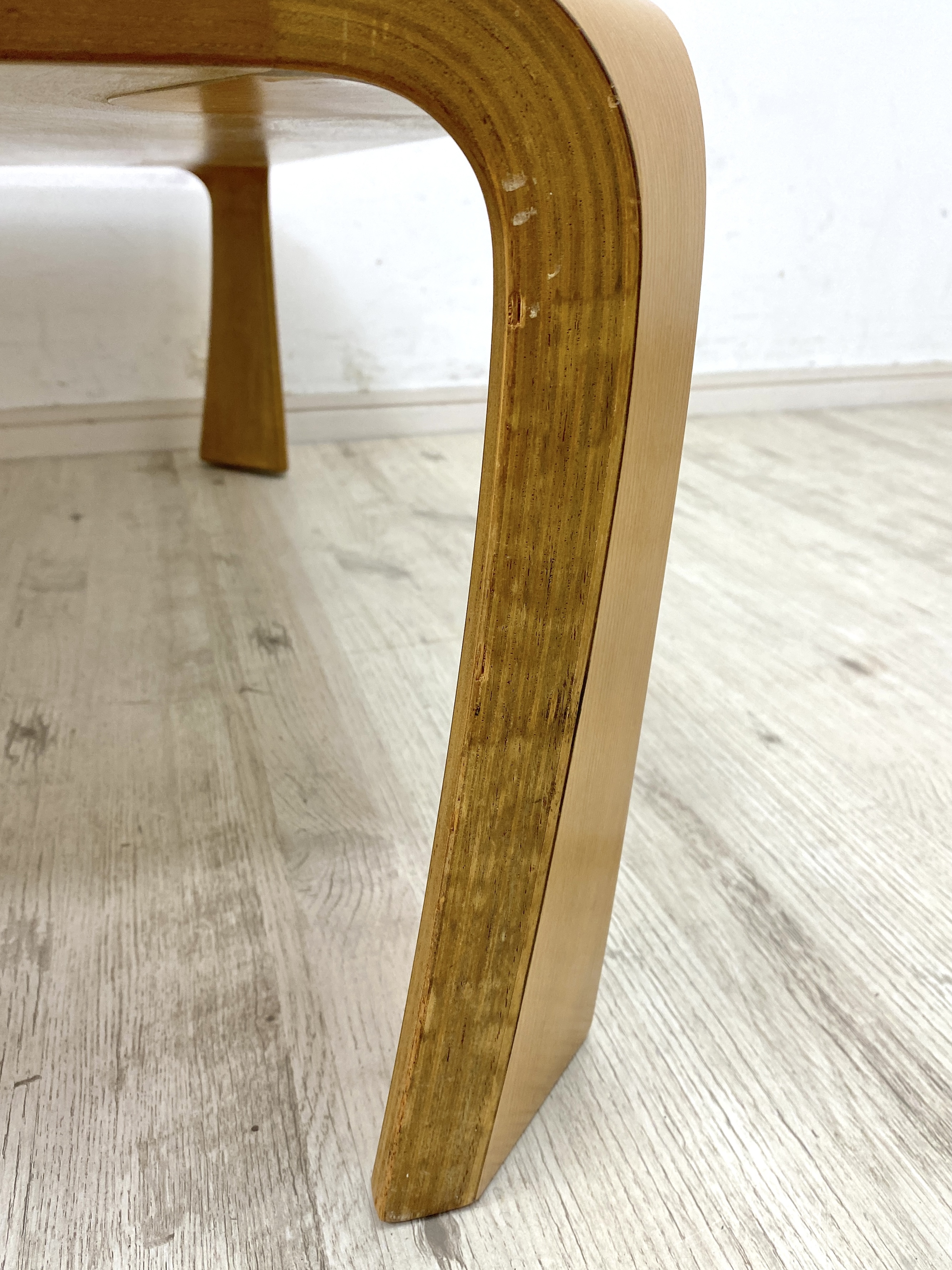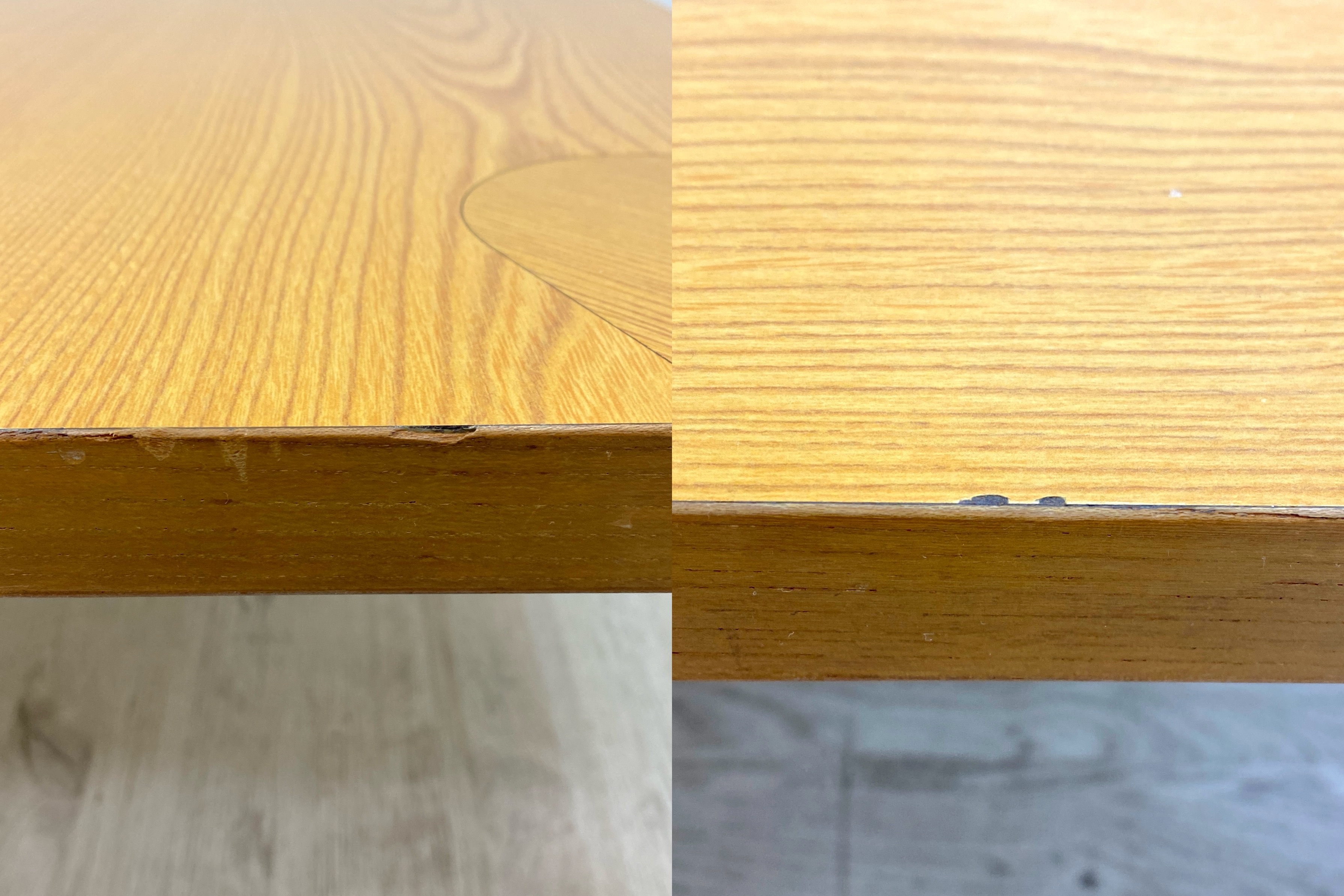 こちらはTENDO 天童木工の座卓です。 中古品です。 【TENDO 天童木工】 1940年に山形県天童市で創業した日本の家具メーカーです。 プライウッド(成形合板)を主力とした家具づくりを行なっており、 天童木工はこの技術を日本で初めて確立しました。無垢材では表現が困難な繊細なデザイン表現を可能にし、 デザイナーのアイデアと職人技が生んだ自由な造形の家具は時代を超えて愛されています。 天童木工の成形合板技術を確立した技術者、乾三郎デザインによる座卓です。 発売から現在まで数十万台もの販売実績のある、天童木工の名作家具です。 「バチ脚」と呼ばれる天板からなだらかにカーブする脚は、下方に向かって広がる美しいラインを描き、 和の雰囲気を醸し出しています。側面が床に対して垂直につくられているため、立て掛ける際も安定感があります。 軽量で移動もしやすく、壁や畳を傷つけにくい設計から、多くの旅館や宿泊施設で採用されています。 上品な木目が美しい天然木を使い、経年による変化もお楽しみいただけます。 和室はもちろん洋室のリビングテーブルとしても活躍するデザインです。 和モダンテイストの空間づくりにいかがでしょうか。 【コンディションについて】 古いもののため、全体にキズや塗装落ち、脚部や天板裏に変色があります。 使用感はあるものの、成形合板による強度と耐久性により長くお使いいただける家具となっています。 他詳細については下記画像も併せてご参照ください。