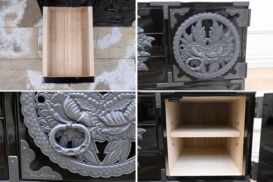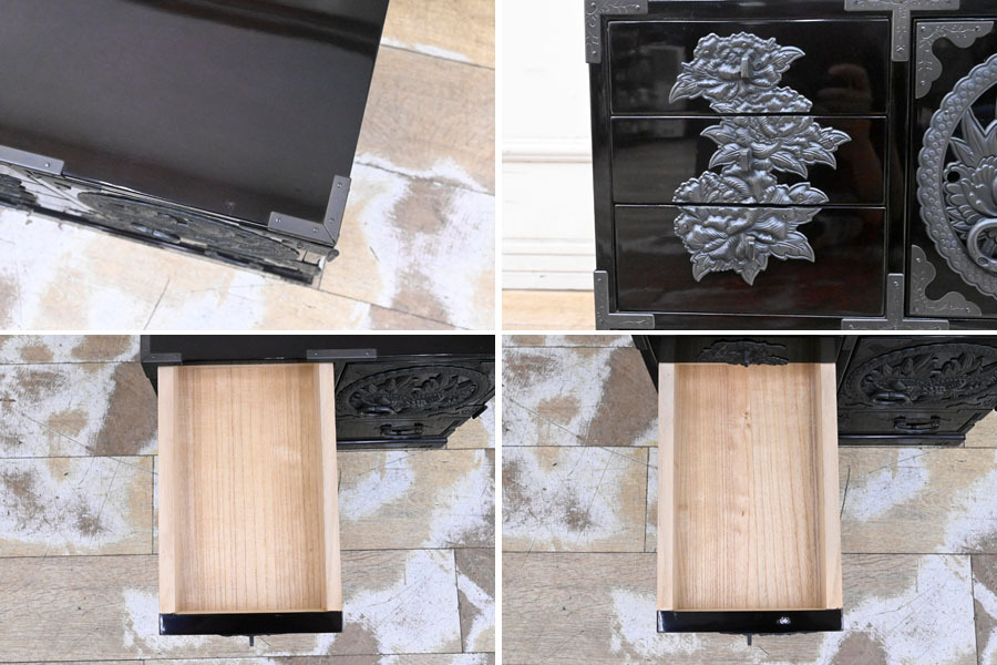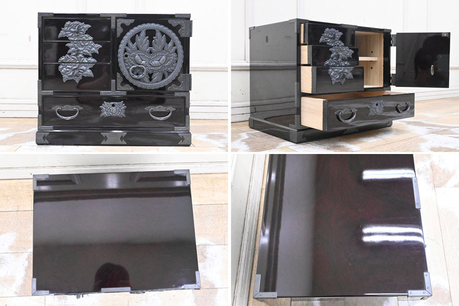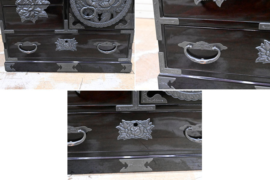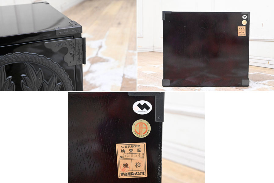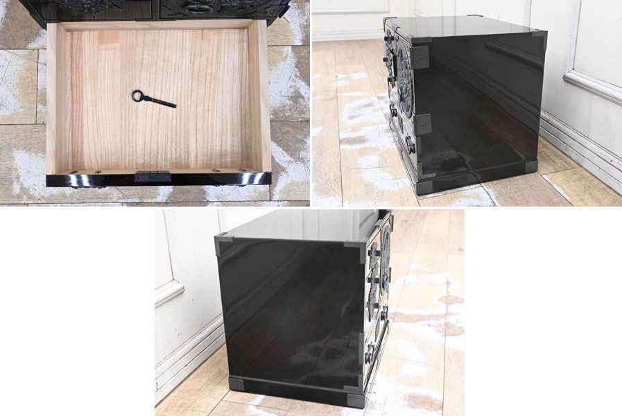 ----------------------------------------------------------------------------------------- ●送料や注意事項は必ずご確認下さい。落札後にトラブルになるケースが増えております。● ◆コンディションは写真・文章にて記載して有りますが、全てのキズの写真は掲載致しておりません。大きなダメージを除き見落とし、記載漏れが有る事はご了承下さい。 ◆当サイトにて出品する商品は多種多彩で、当方商品知識の無い物も多数ありますので落札後の質問やメンテナンス等にはお答えできません。 ◆入札された時点で、画像、文章をご理解していただいたものと判断させていただきます。不明な点は前もってQ&Aからお願い致します。入札後の質問やお電話等でのキャンセルは一切受け付け致しません。 ◆商品説明に「ノークレーム」と記載しているものに関しては、如何なる状況で届いても保証致しません。詳しくは注意事項の「商品到着後について」の最後に記載しておりますのでご確認下さい。 ---------------------------------------------------------------------------------------- 宮城県の推奨品ともなっている非常に高価な小物箪笥、中古超美品の出品です。 美しいまでの漆塗りの光沢と見る者を魅了する重厚感に、一目で分かる極上金具が最高級を演出しています。 誰もが一度は憧れる、漆と重厚金具の質感はぜひ手に入れたい逸品となるでしょう。 幅40.5 奥30.5 高34.5cm 【コンディション】 中古品ですので多少のキズ、多少の汚れ、多少の塗装剥がれ等有りますが超美品と言える奇麗なお品です。 | ||