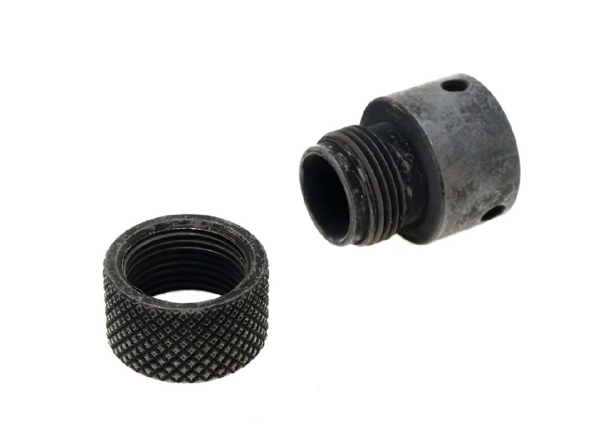 商品説明 ITEM INFO M92Fへのサイレンサー取り付けに KM企画製のサイレンサーアダプターです。東京マルイやデジコン、KWA、KJなどの各社ベレッタM92Fに対応します。 アウターバレル先端にかぶせてイモネジによって3箇所から固定するだけの非常にシンプルなアダプターになっています。先端には14mm正ネジが切られており、各種サイレンサーなどの取り付けが可能です。 各メーカーに対応するためにアウターバレルの外径調整用のスペーサーが付属しています。 商品基本情報・スペック ITEM SPEC ●商品名 : KM企画 M92F対応 3点保持式サイレンサーアダプター 14mm正ネジ ●商品番号 : H9534BM92S ●対応 : 各社 M92F※アウターバレル外径要確認 ●付属品 : 0.2mmスペーサー/六角レンチ/イモネジ ●サイズ : 約18mm×21mm(外径×長さ) ●取付部サイズ : 約15mm×7.5mm(内径×奥行) ●材質 : 真鍮/アルミ ●ねじサイズ : M14/P1.0 注意事項 ITEM NOTE ∇商品固有の注意事項 ※黒染め素材のため表面にムラなどがある場合がございます。予めご了承ください。またサビの防止などのお手入れを必ず行ってください。 ※製品の仕様や価格は予告なく変更する場合があります。またそれに伴う返品・交換はお断りさせていただきます。 ∇ご購入時の留意事項 ※商品はすべて点検してからのお届けになります。商品によってはパッケージの開封等を行う場合もございますことをご了承ください。 ※商品には万全を記しておりますが、万一不備な点がございましたら、お手数ですがお問い合わせフォームにてご連絡頂ますようお願い致します。 ※商品が適合外であった場合、またはお客様都合による交換・返品・返金は出来ません。よくお確かめの上、ご購入下さい。 ※モニター環境により、実際の商品の色と若干異なる場合がございますのでご了承下さい。 ※他サイトでも同時販売の為売り切れの際はご了承下さい。 ※売り切れの際は早急にご連絡させて頂きます。(当社休業日を除く) 関連商品 RELATED ITEM