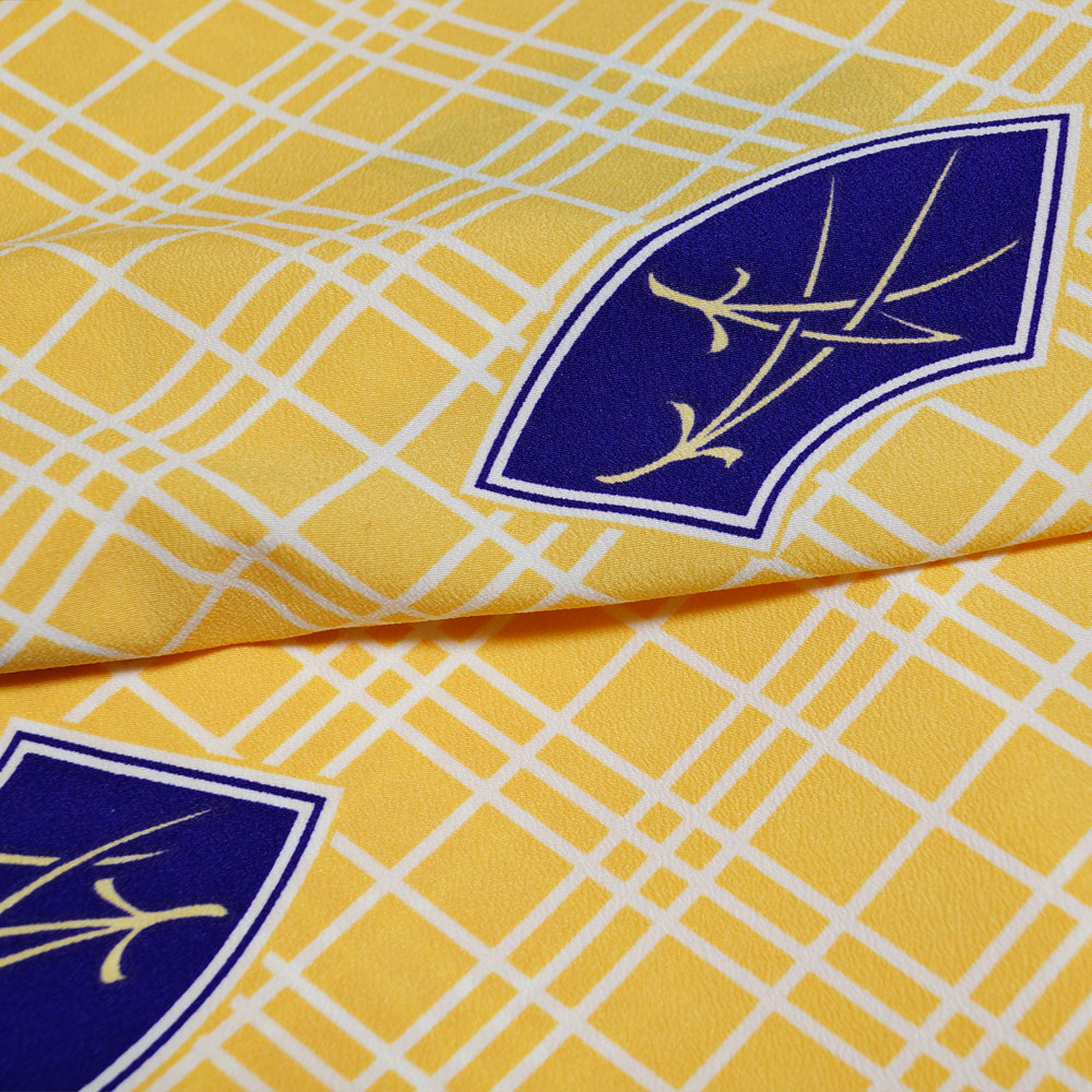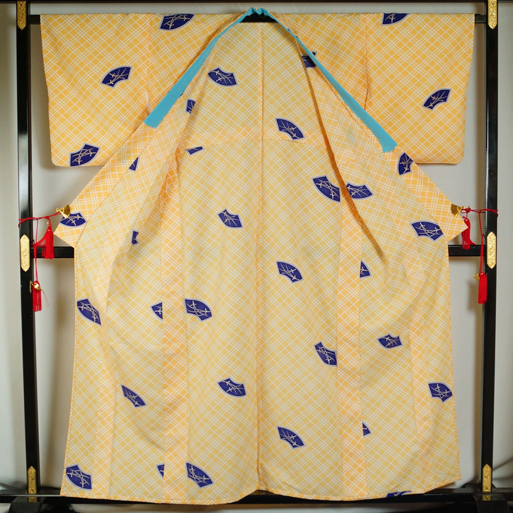 | 商品 説明 | 菱格子模様が染め抜かれた梔子色系の地に地紙に松葉模様が施された踊り用の単衣小紋です。水色系の重ね衿がざっくりと縫付けられています。替え袖(うそつき袖)がついております。 |