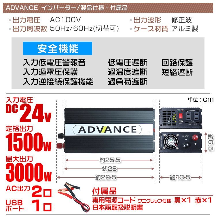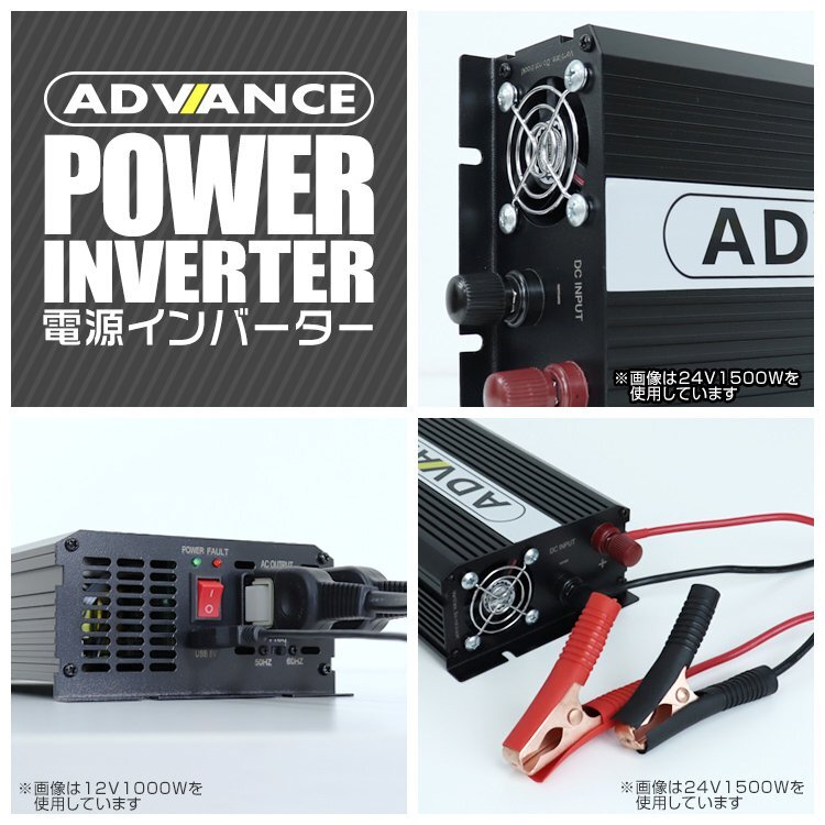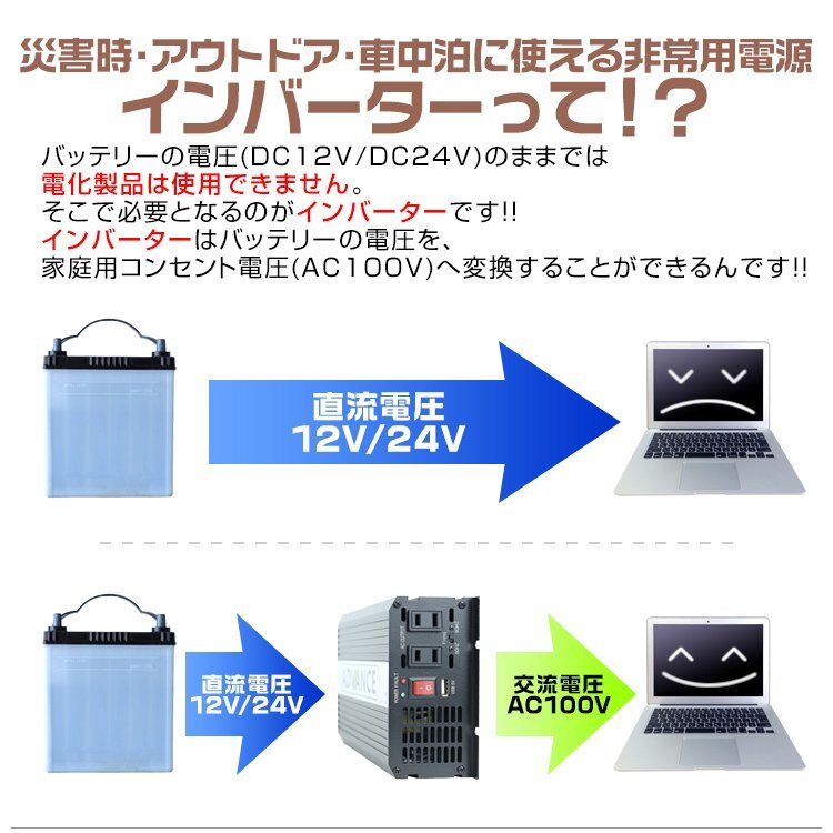 | バッテリーの直流24Vを交流100Vに変換! コンセント3個付で同時に3台の電化製品が使用可能! アウトドアはもちろん、緊急時や災害時などにも大活躍! |