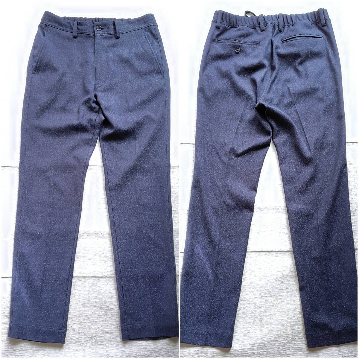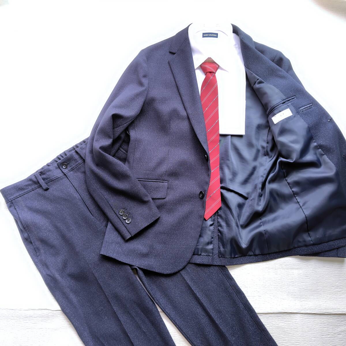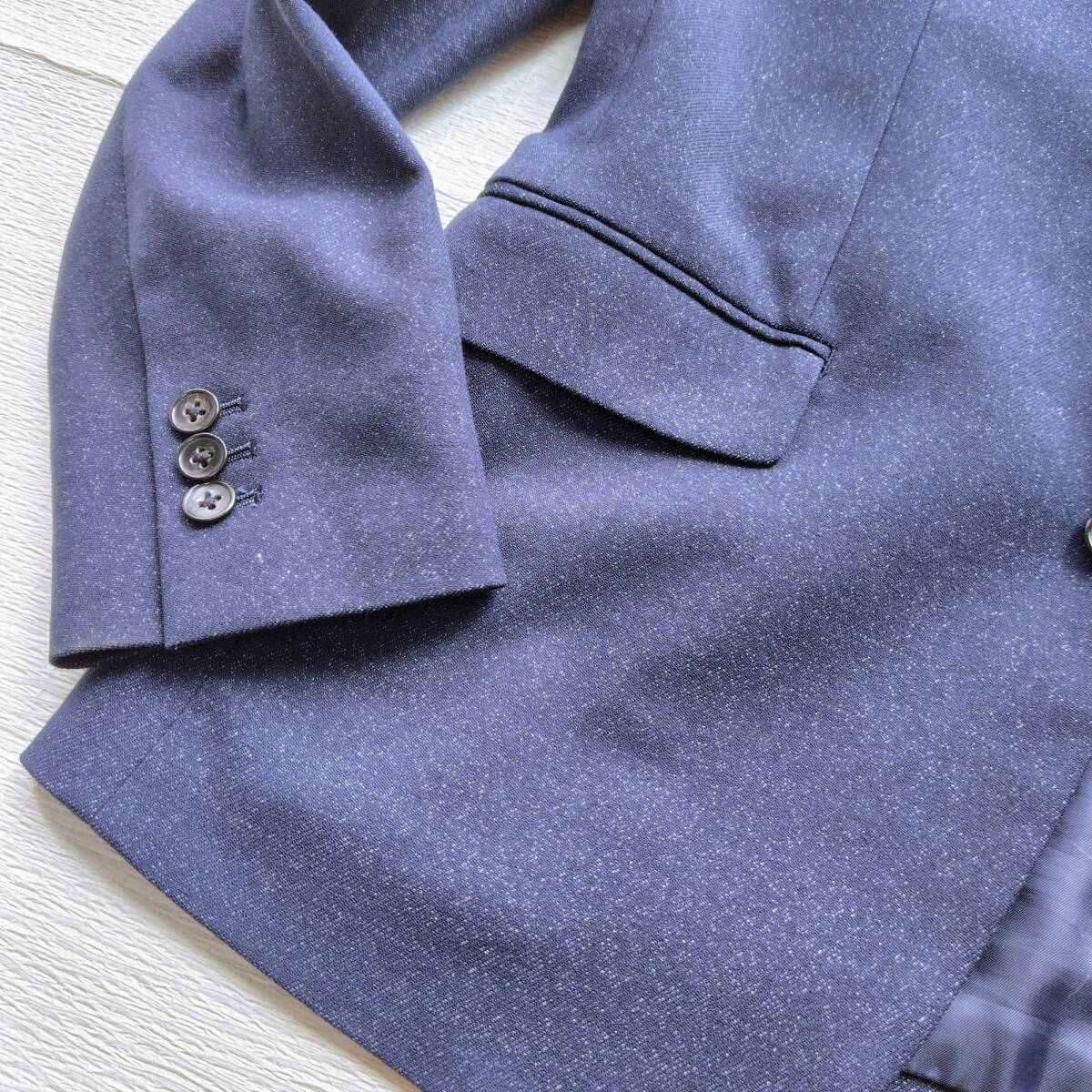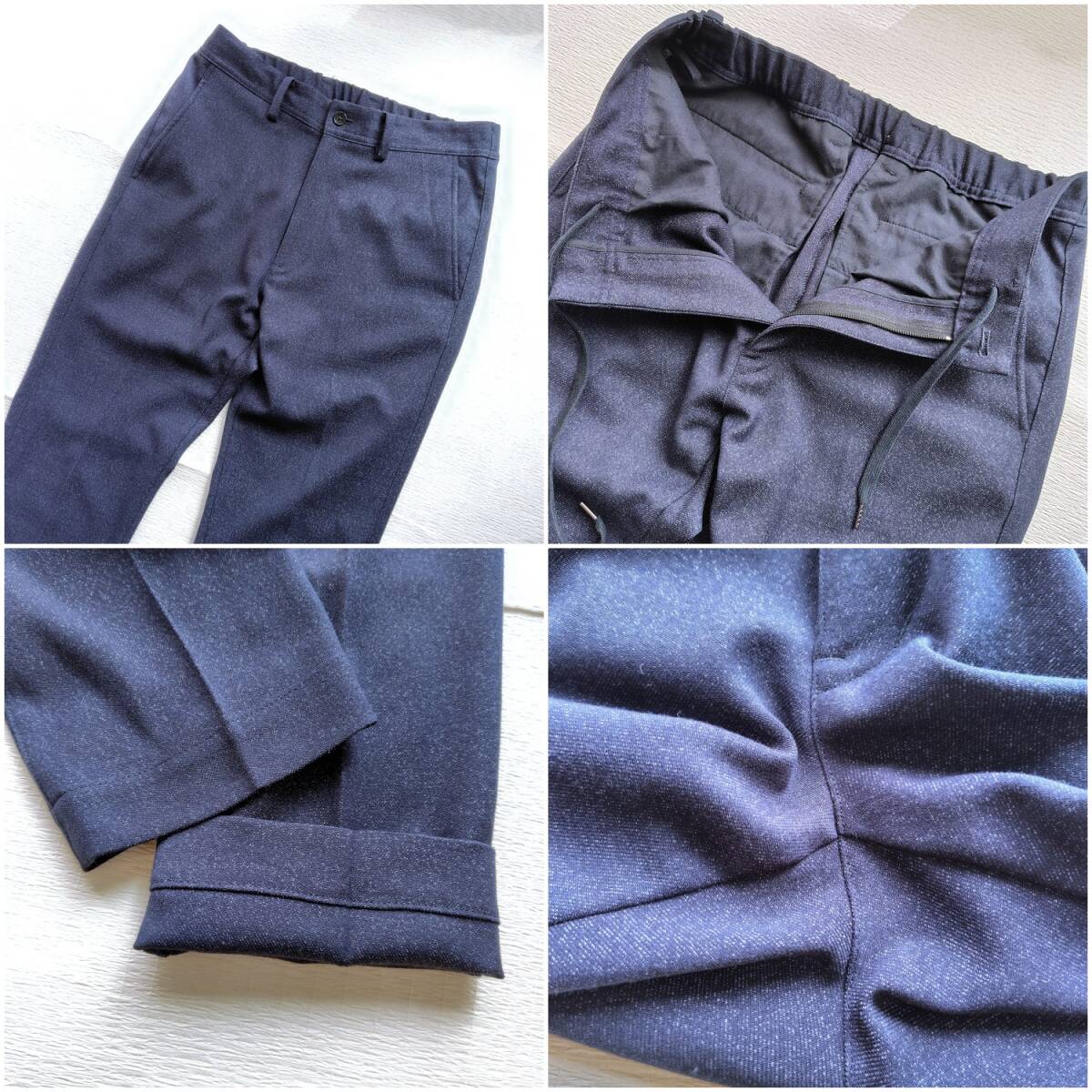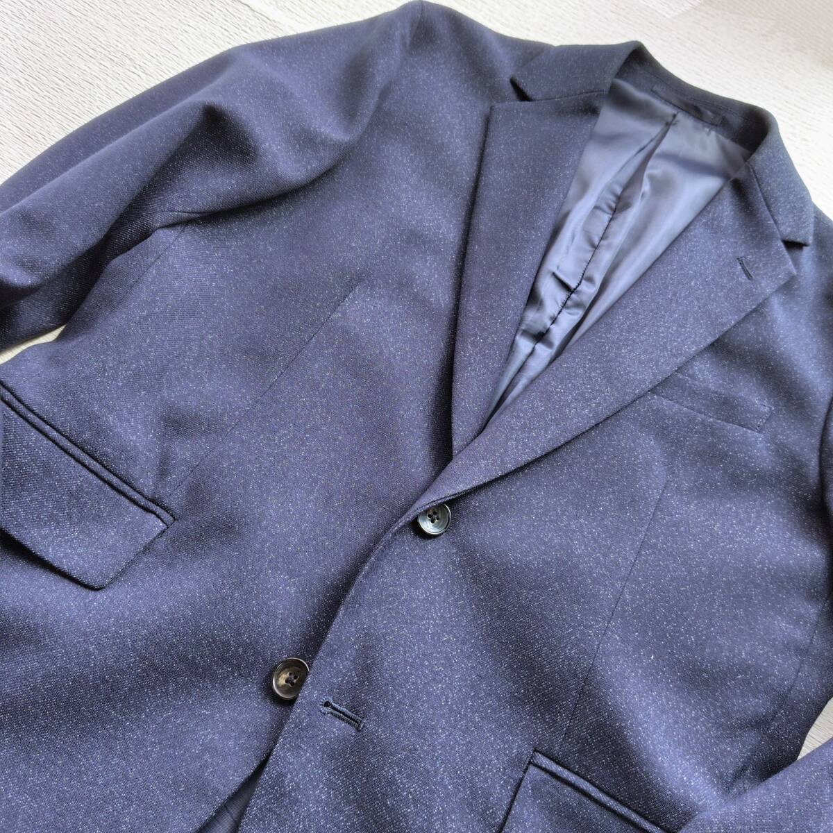 霜降りのような、表情豊かなネイビー生地が洒落た印象のカジュアルセットアップです。このスーツの魅力は、なんといってもその快適さ。ストレッチの効いた生地が体の動きに寄り添い、パンツのウエストはゴム仕様になっているため、窮屈さを感じさせません。見た目はスマートでありながら、リラックスしてご着用いただけます。
