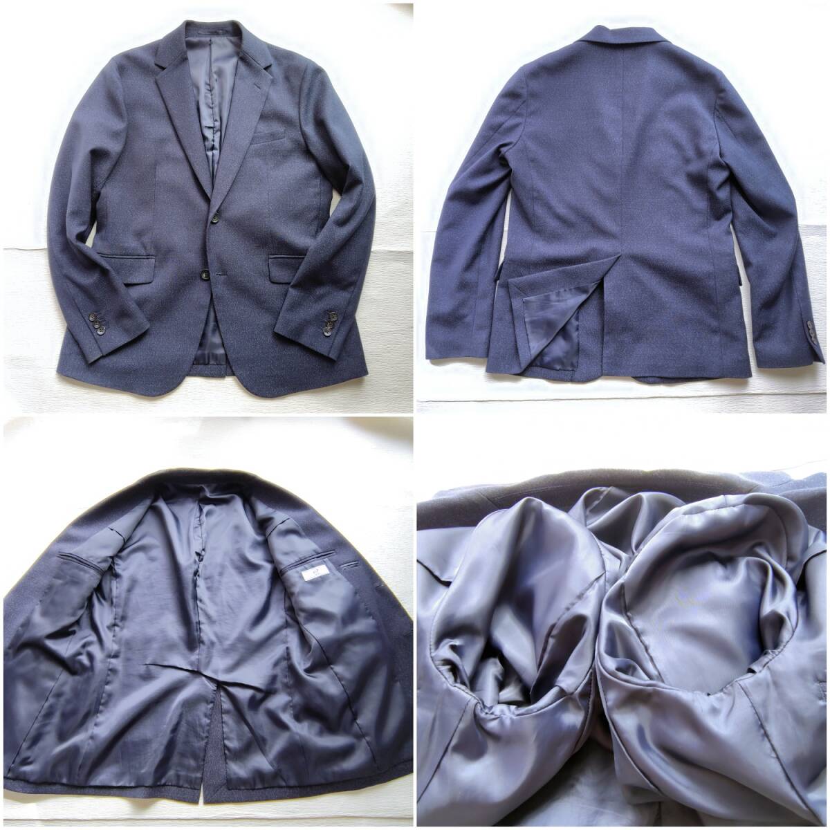 袖口や襟の内側に着用に伴う薄汚れ、ポケットの内側に毛羽立ちがございます。また、生地にほとんど目立たない程度の毛羽立ちが見られますが、ご着用に支障のある大きなダメージはございません。
