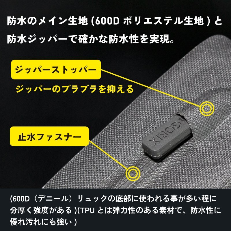 防水性のあるメイン生地(600Dポリエステル生地)と防水ジッパーで確かな防水性を実現。