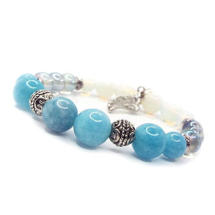 | 【STONE KITCHEN 天然石 パワーストーン】 フェザーチャームが可愛い☆ 大空へ羽ばたくイメージをブレスレットにしました♪ 身につけることで石のエネルギーが優しく寄り添ってくれるはずです!!! 綺麗に澄み渡った青空のようなブルーで手元を彩って☆ 内周:約16cm サイズ:ブルークォーツ(天然クォーツ染め) 10mm・8mm グリーンオーラ水晶 8mm シンセティックオパール 10mm・8mm 1点 注意事項 ※金属部分は汗や汚れ等で変色する場合がございます。気になる場合は 金属磨きや布等で軽くふき取る事をおすすめします。 ※石の種類によっては、艶を引き出すことを目的として、ワックスや着色加工がされているものもあります。 ※表示のサイズは必ずしも最大値・最小値のサイズのものが入っているわけではございません。 ※天然石のため同じものでも色味・模様などが異なります。 ※照明の具合で実際とは色合いが異なる場合がございます。 また、天然素材特有のクラック・内包物を有する場合がございます。予めご了承下さい。 | |