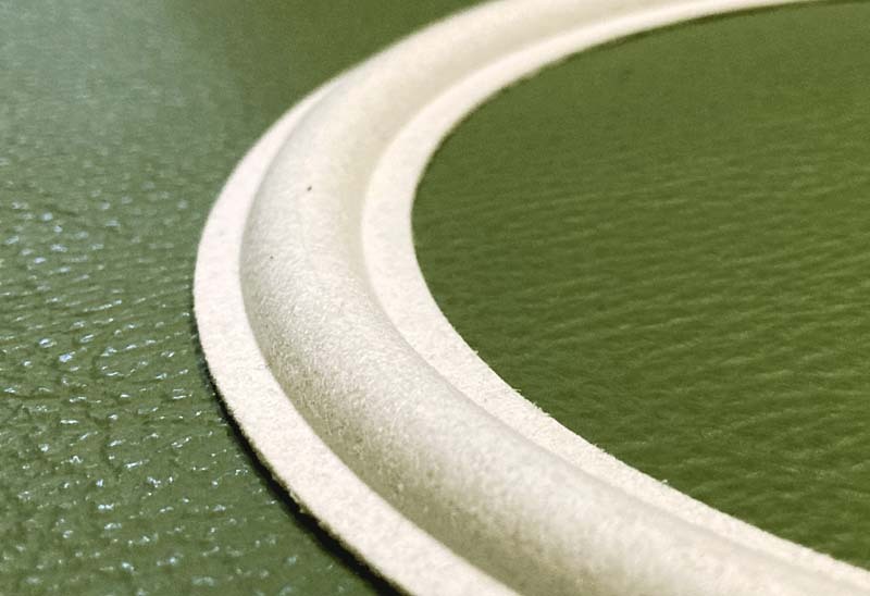 素材には「ウルトラスエード」や「アルカンターラ」の名で知られる「東レ・エクセーヌ」を使用しております。軽量で柔らく、適度な反発力と復元性があり、音響特性に大変優れた革新的な素材となっております。自社にて熱成形プレス機で加工、製品化をしております。 小音量時にも入力信号にたいして機敏に反応するエッジで、低音の解像度が良く、動作は温度変化に影響されません。また、劣化がないためエッジの寿命は半永久的となります。 現在に至ってウレタンエッジが音響特性上最も優れているとされておりますが、経年劣化での音質の変化、加水分解で剛性を失い、朽ちるという問題があります。また、業務用スピーカーに多用されているクロス素材のエッジ(繊維を織った布)は耐久性はあるものの、形を保たせるための固着剤を要するため、他の素材と比較して固いものも多く、経年で更に硬化することがあります。柔らかめに作られているものは反発(復帰力)が十分でなく、振幅制御にスピーディーに反応しません。 人工皮革エッジは《高音質、高耐久性》、安心して末永くご使用できるエッジです。 ●LE8 や初期の LE8T/PR8 には「ランサロイ」という、元は柔らかい発泡ゴムエッジが使用されておりました。新品時は白いエッジでありますが、経年劣化で黄土色に変色し、硬化しております。本来の色と性能の復活に最適のエッジです。