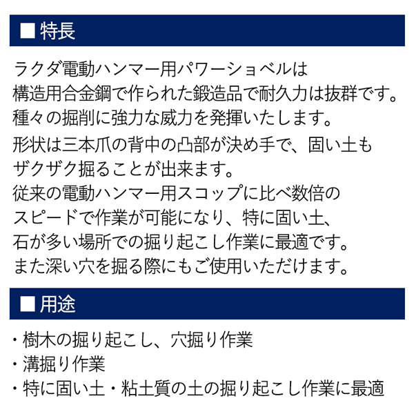 従来の電動ハンマー用スコップに比べ数倍のスピードで作業が出来ます。
