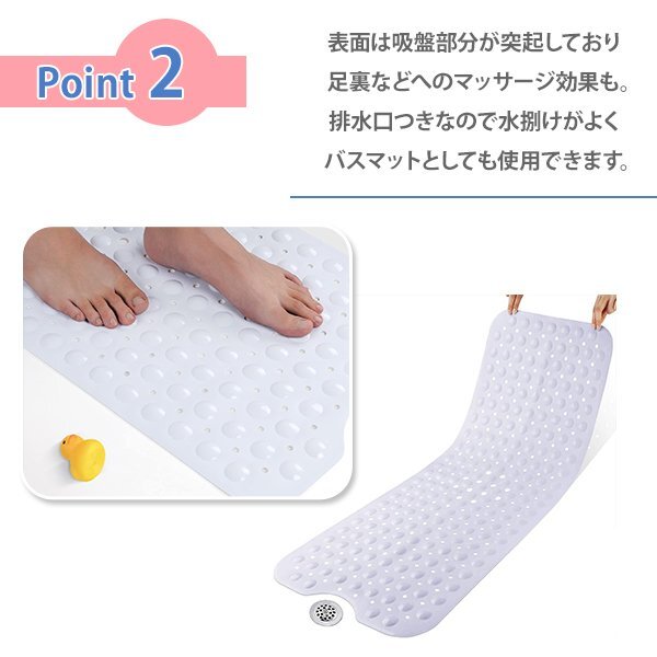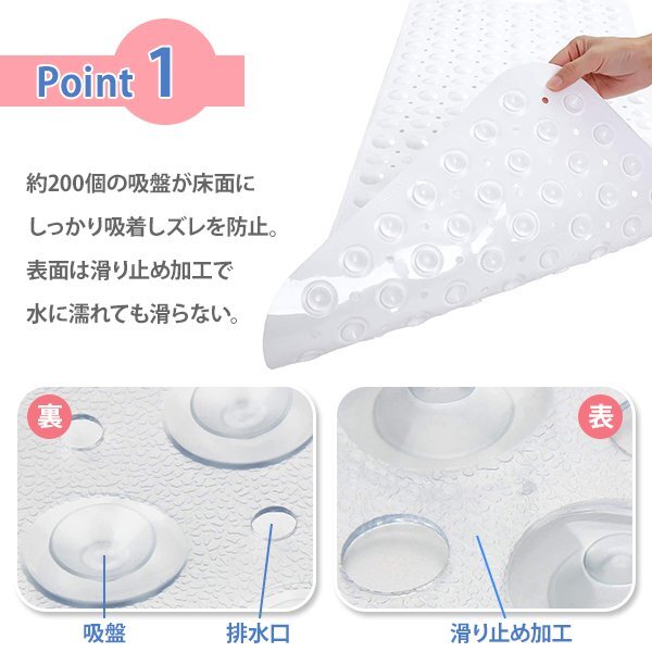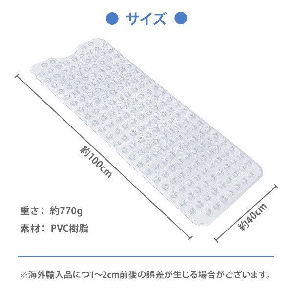 ☆滑り止めマット ※ご購入されましたらオーダーフォームに【カラー】をご連絡ください。 【カラー】 ・ホワイト ・クリア 【商品名】 滑り止めマット 【説明】 バスタイムを安全・安心・快適に! 浴槽内に設置して入浴中の転倒などを防止する滑り止めマットです。 約200個の吸盤が床面にしっかり吸着しズレを防止。表面は突起物により足裏マッサージ効果も。 表面には滑り止め加工と水捌けをよくする排水口があり、バスマットとしてもお使いいただけます。 洗濯機に入れて丸洗いが可能なので手入れもお手軽です。 【カラー】 ・ホワイト ・クリア 【サイズ】 約100cm×40cm 【素材】 PVC樹脂 ( お風呂マット バス用品 お風呂用品 浴室 浴槽内 すべり止め 子供 妊婦 高齢者 介護 事故防止 足ふきマット 足拭きマット 速乾 排水 ズレない 吸盤式 滑らない ) |