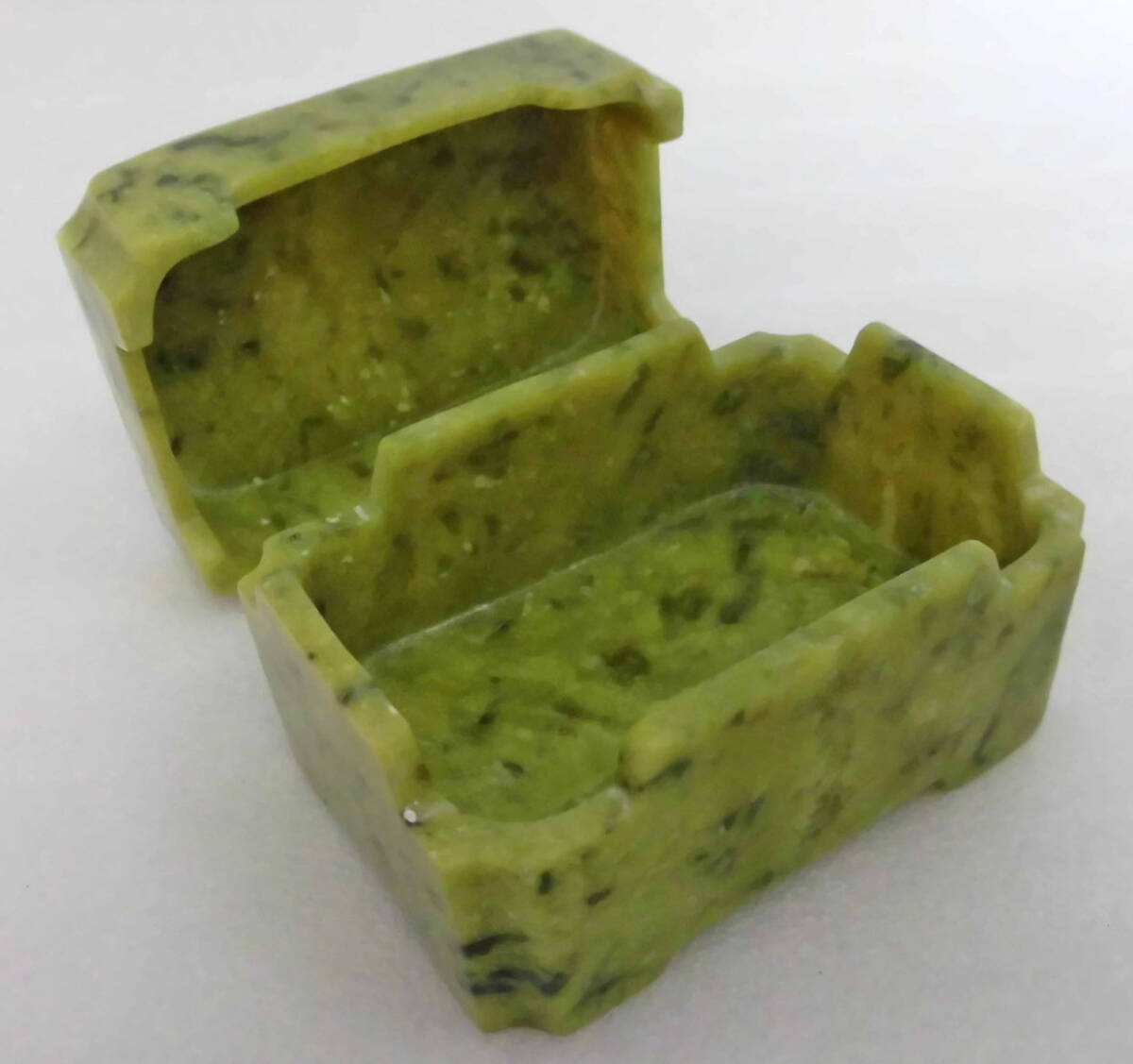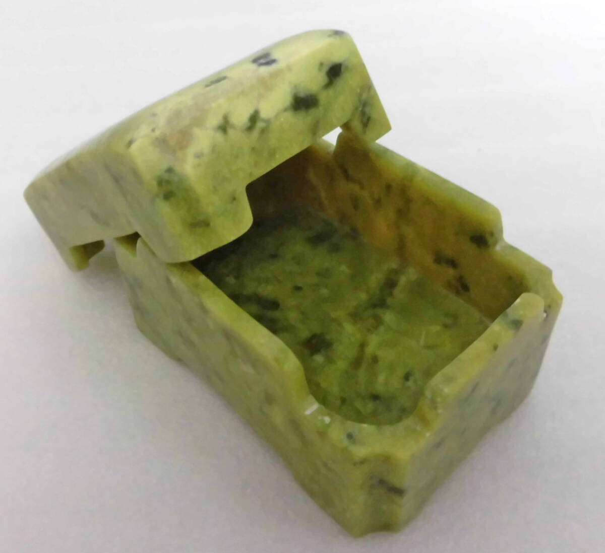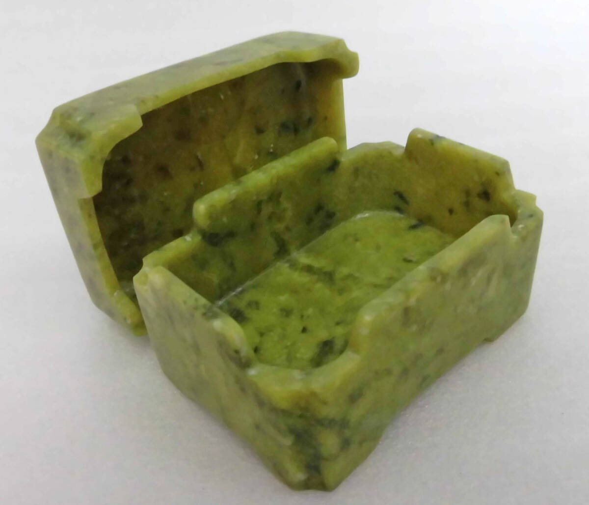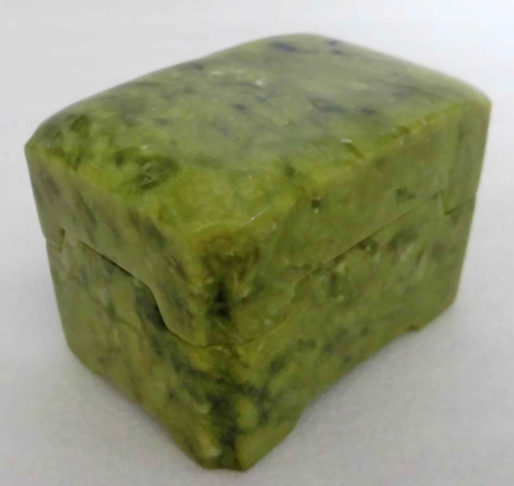 | 品名:碧玉 巾合・香合・薬缶H 茶道具 作家:林 白祥 寸法:6.9x4.7㎝ 丈4.5㎝ ≒140g 蓋と本体の合口加工は天然石故に超・超絶技巧です。 できるだけ説明いたしますが、写真でご判断ください。写真の色の誤差はご容赦ください | ||