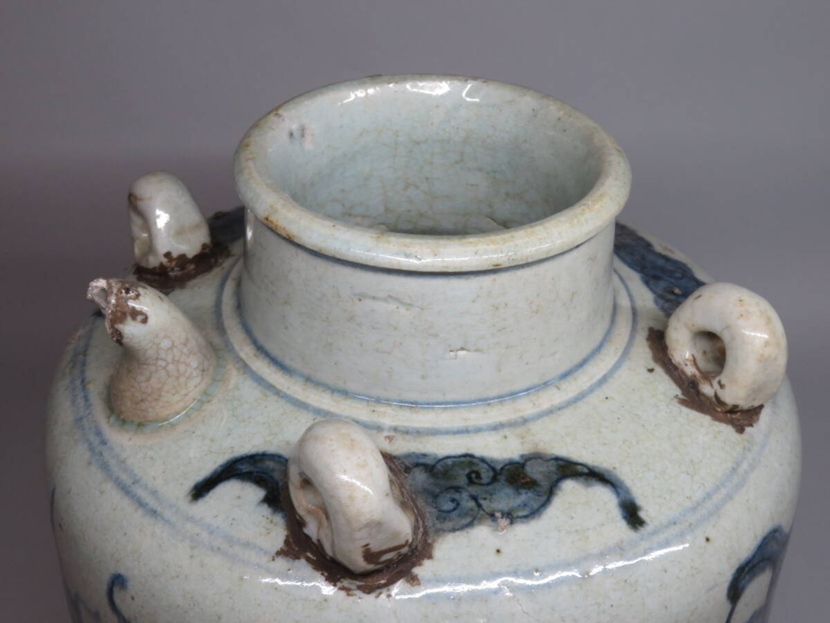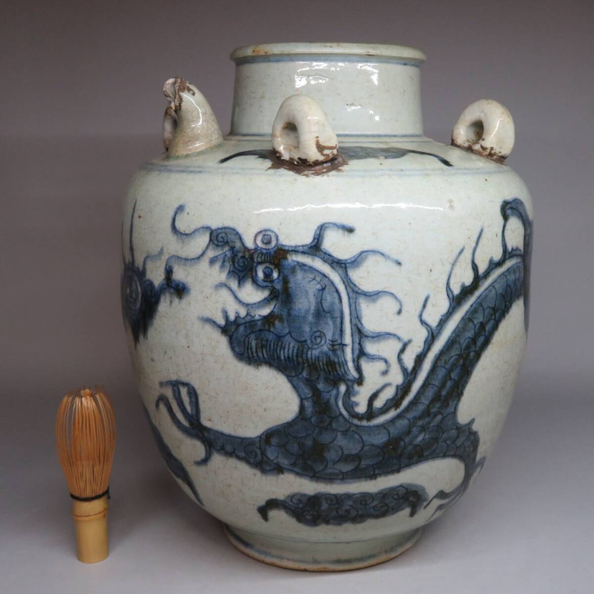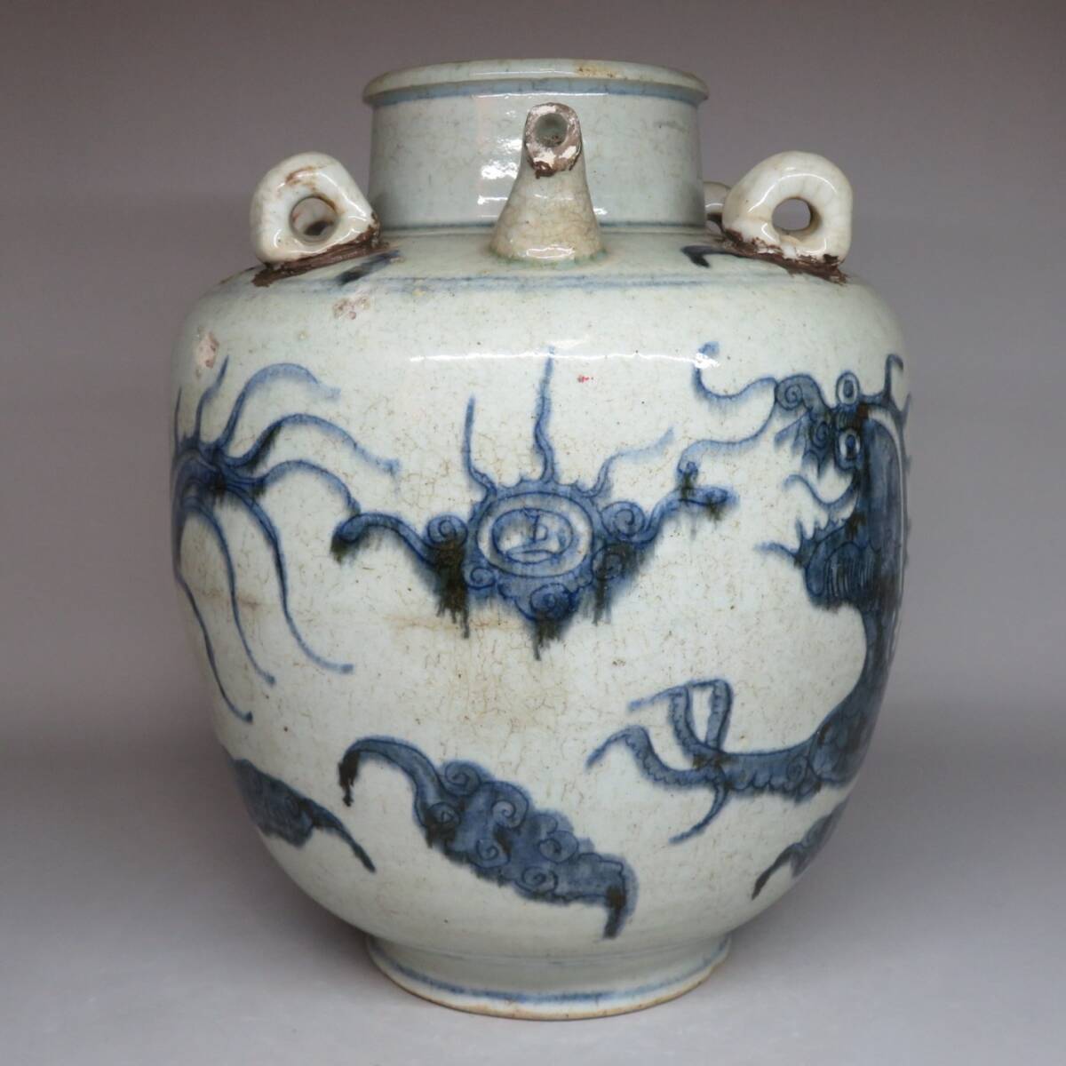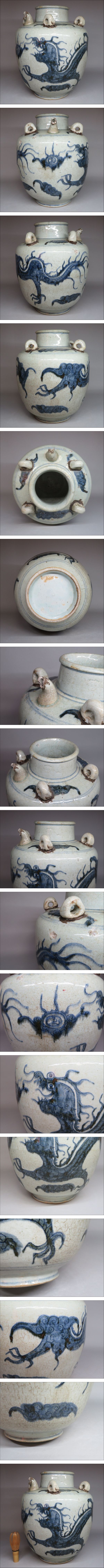 | 「都内コレクター所蔵品」ベトナム(越南)時代古陶 安南染付雲龍文四耳壷 水器 安南焼 東南アジア古陶器 | |||