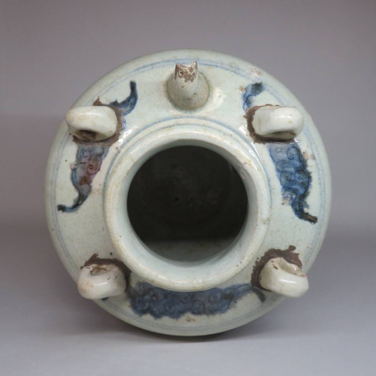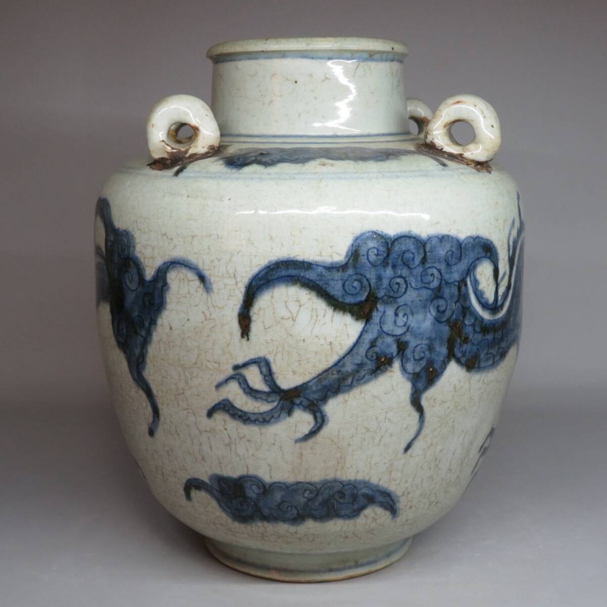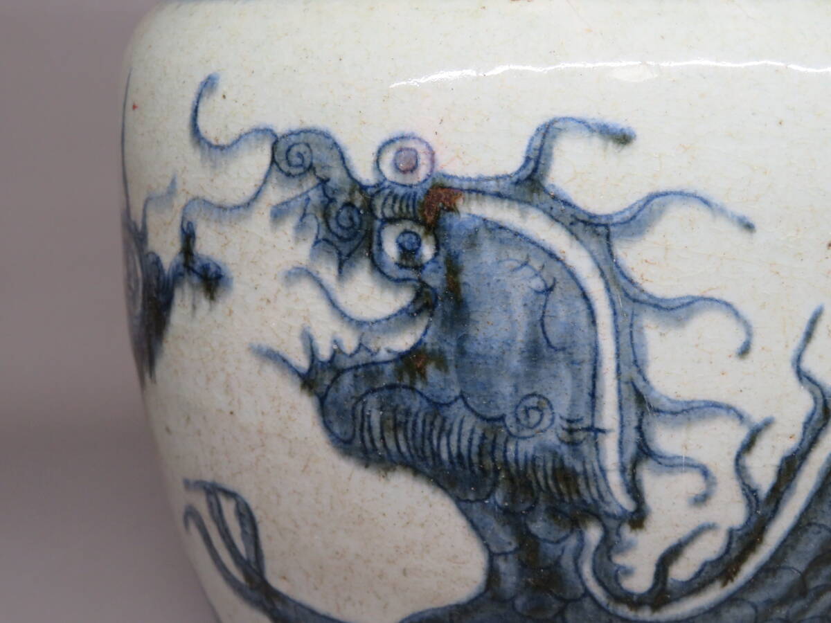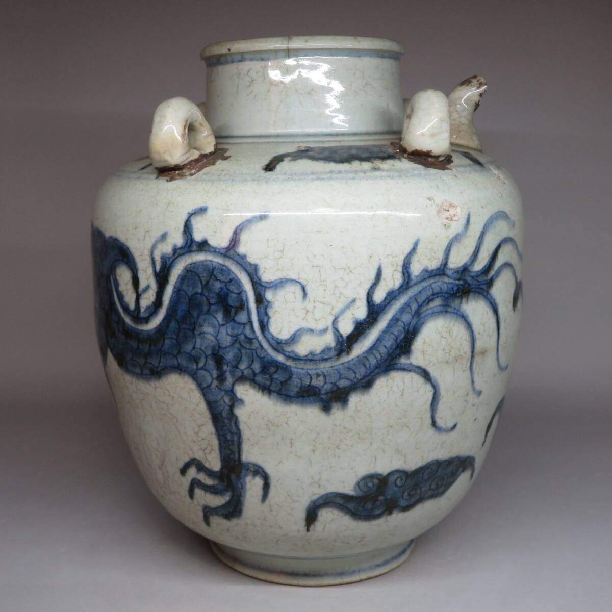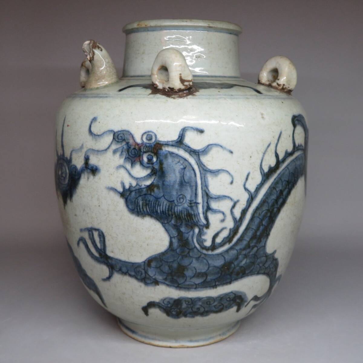 | 「都内コレクター所蔵品」ベトナム(越南)時代古陶 安南染付雲龍文四耳壷 水器 安南焼 東南アジア古陶器 | |||