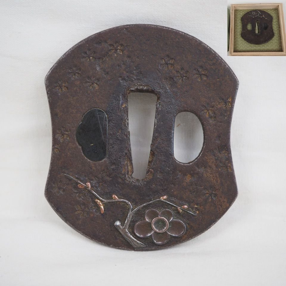 | 商品説明 | 厚さ約 0.6cm 幅約 7.8×6.8cm 重さ142g ご覧のように、江戸時代の銀象嵌梅花文鍔です。梅花文象嵌が施されており、大変良い品です。状態は良好です、詳しくは写真でご確認ください。 |