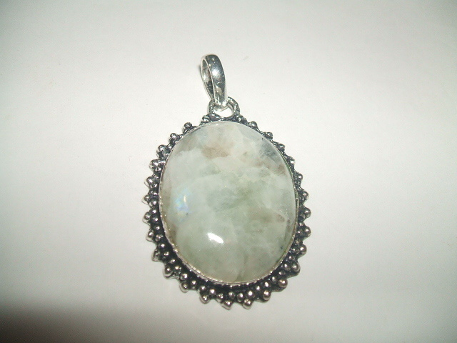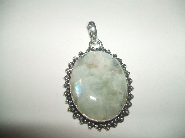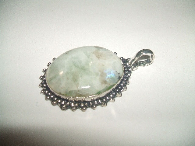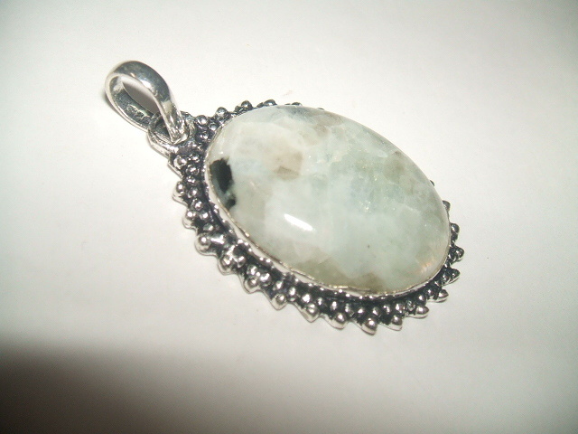 白い結晶の間からわずかに発光が見られるレインボームーンストーントップです。石の表面全体の発光はなく、透明部分もありません。黒い内包物が上の方に少し見え、内部に入っているものは少しグレーがかって見えます。石の大きさは2.8x2.2センチ。金属はシルバーで925の刻印があります。写真では石の内部にグリーンカラーのようなものが見えますが、実際には白い結晶だけで、グリーンカラーは見えません。写真と実際の石の色や雰囲気は全く同じではありませんので、あらかじめご了承ください。| 出价者 | 信用 | 价格 | 时间 |