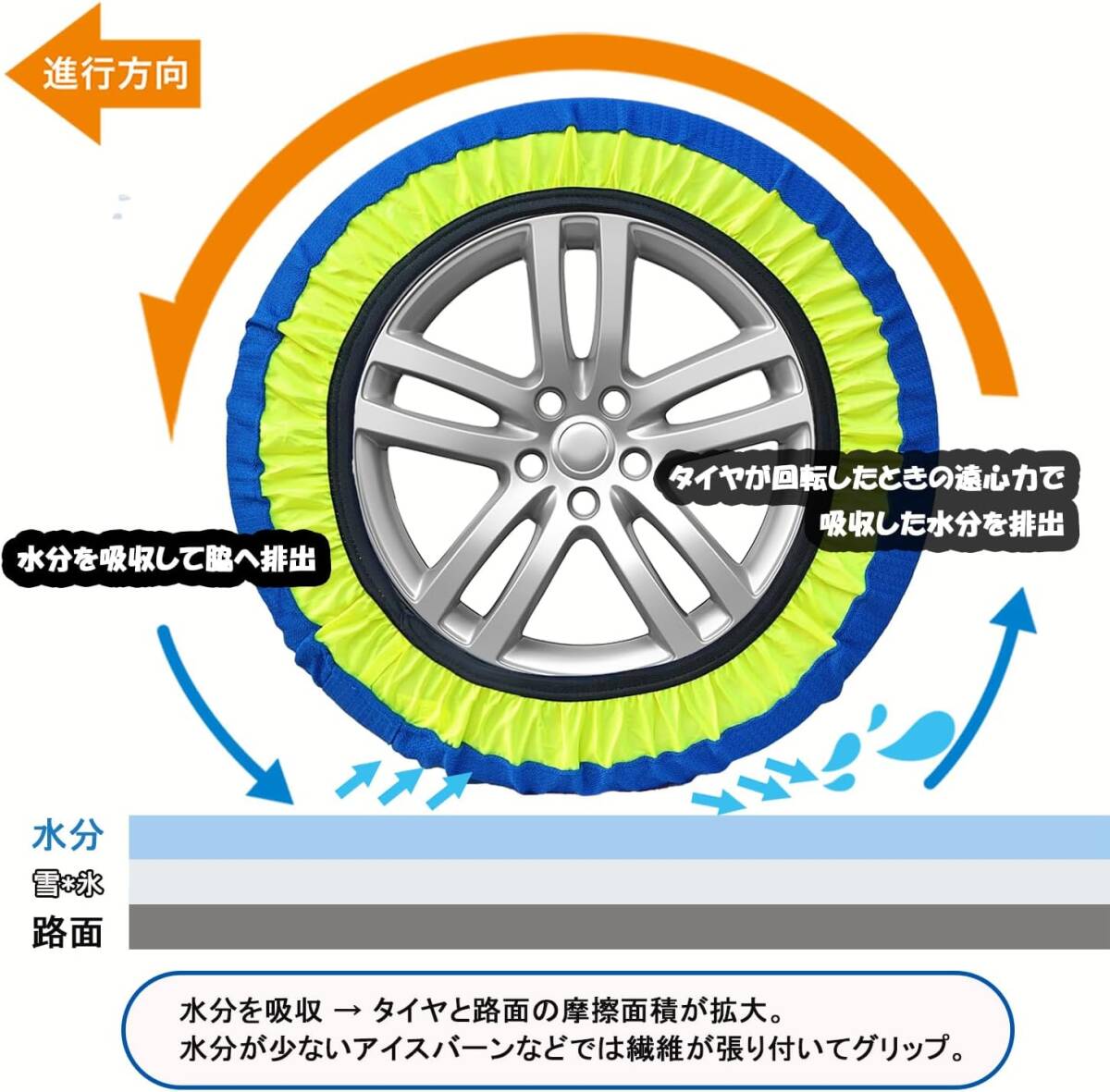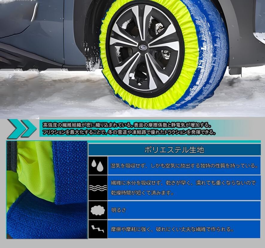 | 【タイヤチェーン布製】YEZOND非金属タイヤチェーンの表面は3Dファブリック技術を使用して強靭な繊維と撚(よ)り糸で織られています、特殊繊維が路面との摩擦面積を最大限に確保し、表面の毛羽立ちが雪面に張り付いていく際に生まれる抵抗性を利用したグリップ力が絶大な効果を発揮。 (冷蔵庫から出したばかりの氷に指で触れるとくっついて離れなくなるのと同じです) 【安全で静か】金属チェーンよりも優れており、 100%タイヤ覆う,低振動 ,低騒音 !雪道で金属タイヤチェーン同等の機能を発揮しますが、低クリアランスに対応し、ABS、ESP、および合金リムを損傷しません,車に損傷を与えるリスクがありません,安全で環境に優しい。 【軽くて収納しやすい】金属チェーンと比較して、布チェーンは軽量です、重量は約1KGです。 厚さ約1mmなので、クリアランスの少ない車や輸入車にも装着可能! 布製チェーンは折りたたんでしまえますので、かなりコンパクトになってスペースを節約できるメリットがあります。 【素早い取り付けと取り外し】 YEZONDカースノーソックスは数分で取り付けられます,ジャッキアップも特別な工具も不要です。さまざまなサイズで、小型車から SUV まで対応 (サイズ表の画像を参照)1 ペア = 2 ホイールの 2 個。駆動輪に取り付けます。購入する際は、タイヤのサイズを確認し、適切なモデルを購入してください。 【チェーン規制に適合】 布製タイヤカバーは、チェーン規制にも対応しているアイテムで、雪道を安全に走行するための頼もしい助けとなります。BL74適応タイヤ: 225/70R14 185/80R15 195/75R15 205/70R15 215/70R15 225/65R15 245/60R15 175/75R16 185/75R16 205/65R16 215/65R16 225/60R16 245/55R16 185/65R17 225/55R17 215/55R17 245/50R17 215/50R18 235/45R18 265/40R18 196/75R15 215/75R14 195/70R16 205/60R17 245/40R19 245/35R20 L115 |