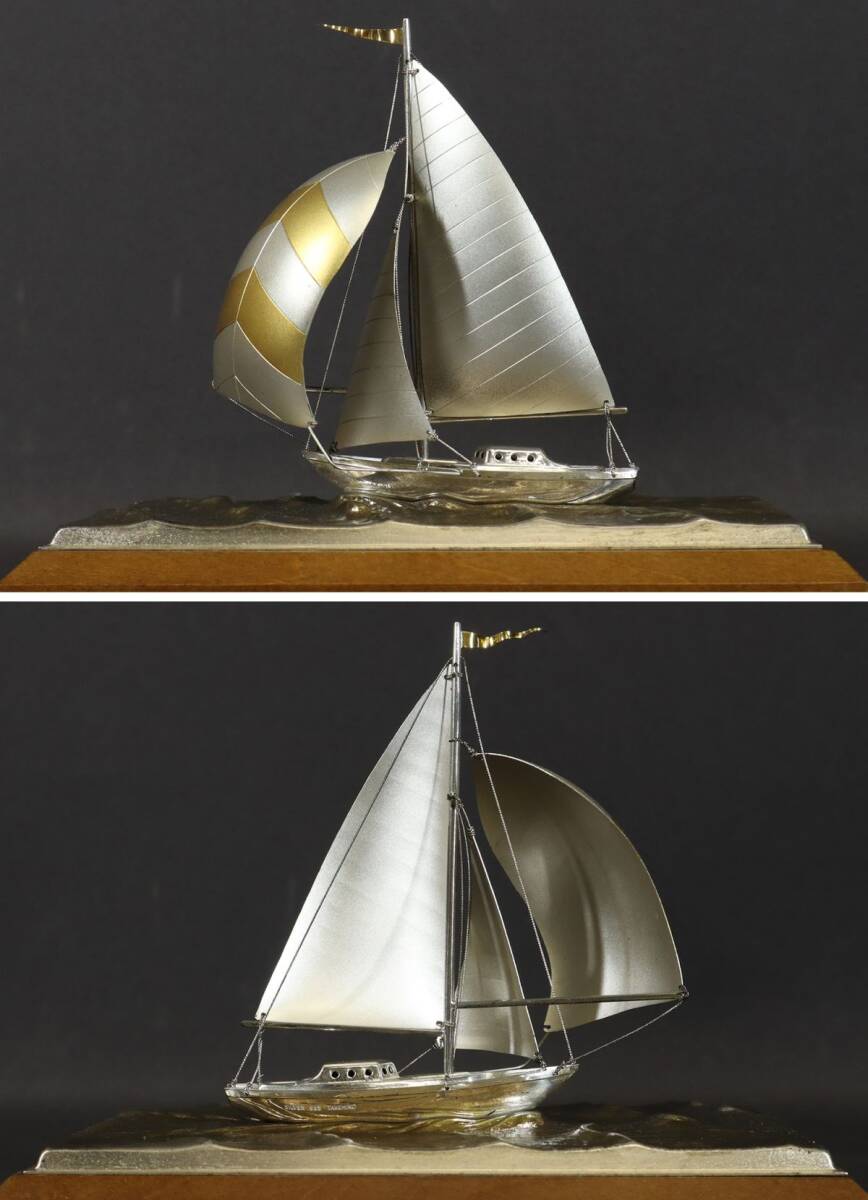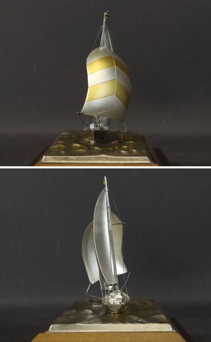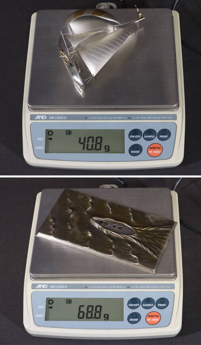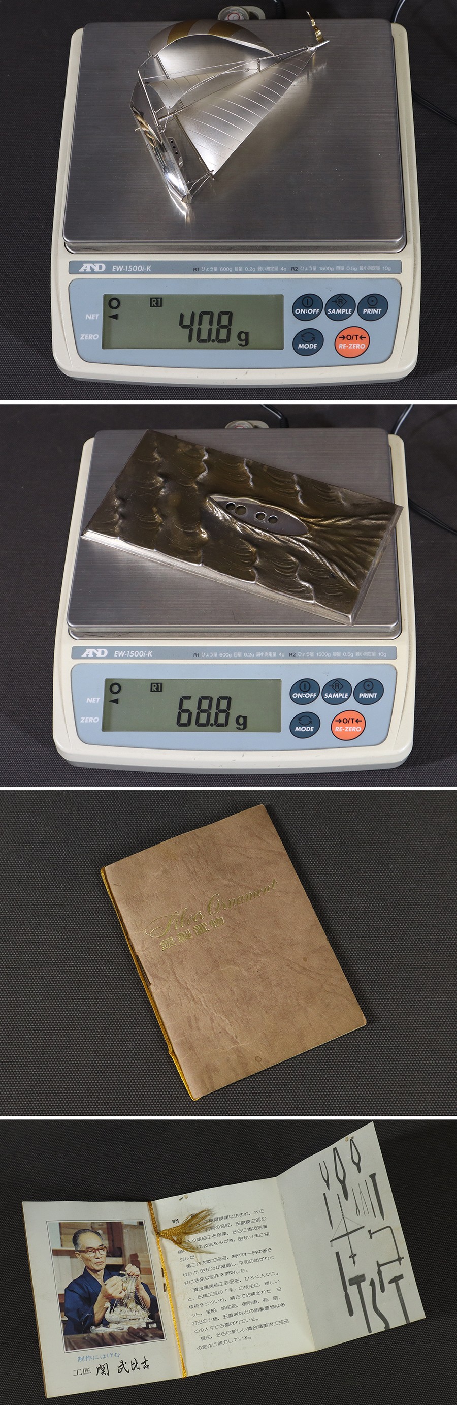 関 武比古 作 銀製ヨット 帆船 置物 TAKEHIKO SILVER 985 銀細工 栞付 ケース入り です。 状態は画像でご確認ください。 船側面に SILVER 985 TAKEHIKO、波部にSPの刻印があります。 船重さ:40.8g 波部重さ:68.8g ケースサイズ:19.5cm×12cm 高さ21.5cm いずれもおおよそです。 画像にある物が全てです。 ※撮影に伴う備品類は付属しません。 万が一、タイトルなど記載に誤りがある場合は恐縮ですが画像を優先してご判断ください。 土日は営業時間外ですのでご質問は平日にお願いします。 (返答可能時間 月~金曜日 10:00~17:00) ※いたずら目的の入札や落札後にお取引を放棄する 無責任な行為を防止するため 誠に不本意ではありますが、 新規IDおよび悪い評価が複数回ある方の ご入札は当方により取り消しいたします。 あしからずご了承ください。 |