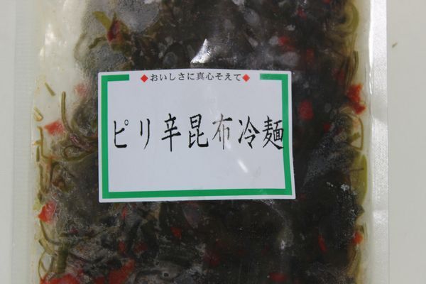 | 北海道で水揚げされる早採れ昆布を〔麺〕に見立て、ピリ辛の冷麺風に仕上げました。 |