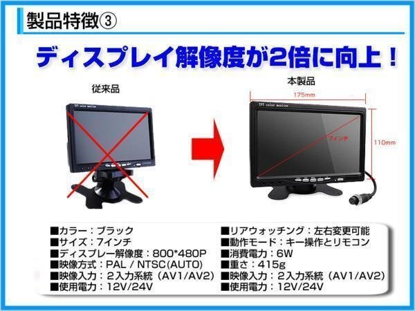 | 液晶サイズ:7インチ 解像度:800×480 消費電力:7W 映像入力端子:専用4ピン2系統 映像入力切替機能:1系統のみバックギア連動可能 定格電圧:DC12V / DC24V 本体サイズ:横173mm × 高さ113mm × 奥行21mm |