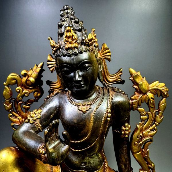 如来にはならずこの世の生きとし生けるものが悟りを得るまで救済の修行を続ける菩薩として日本でもなじみの深い観自在菩薩。その観自在は様々な姿をとりますが本品はその1つの姿である六字観自在菩薩(クァーシェリィ/シャダクシャリー)。マントラ(真言)である「オムマニパドメフーム」という6節が神格化された菩薩。代々受け継がれてきた彫像職人によるハンドメイドの品。大きさ約250mm。