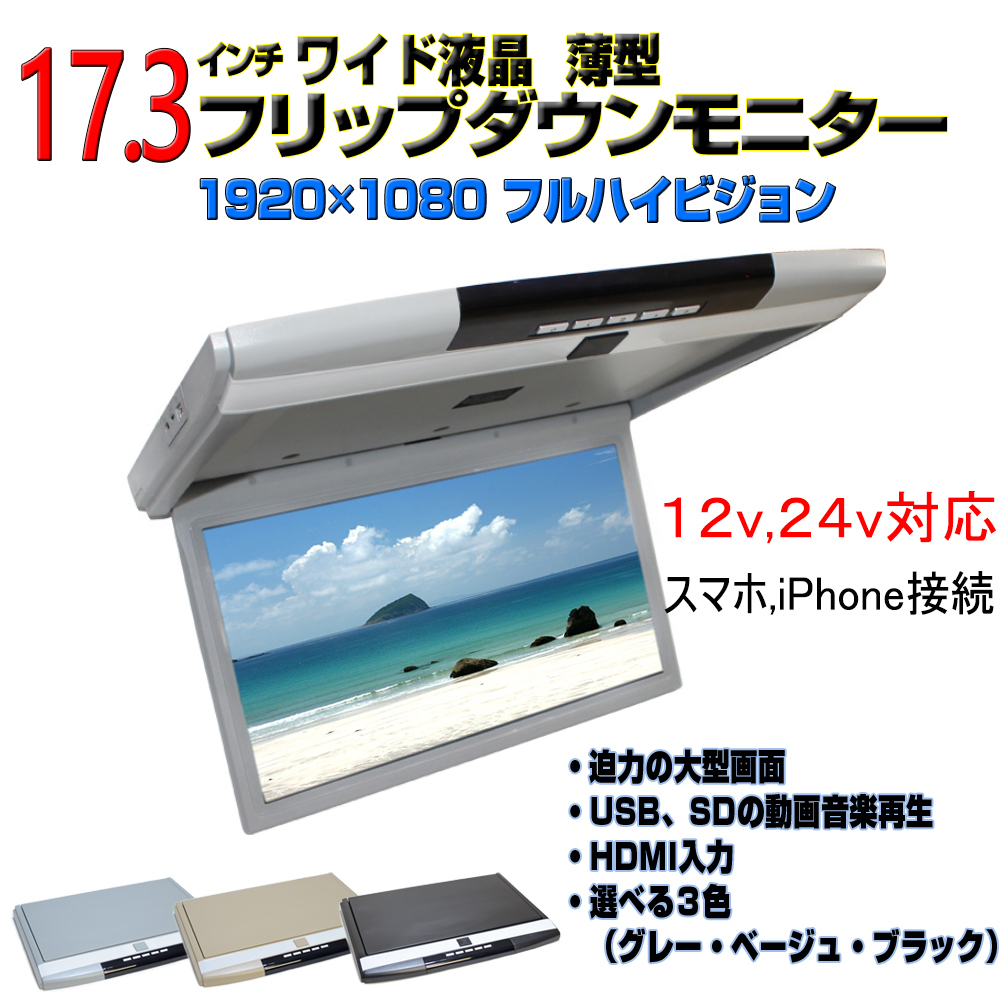 フリップダウンモニター17.3インチ 1920×1080pix 高画質 フルハイビジョン WXGA液晶モニター 大型液晶モニター 3色 スピーカー HDMI USB SD 安心1年保証