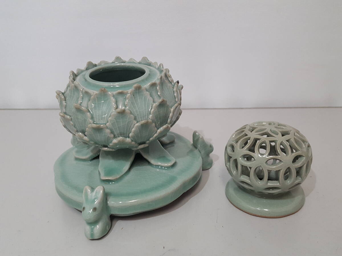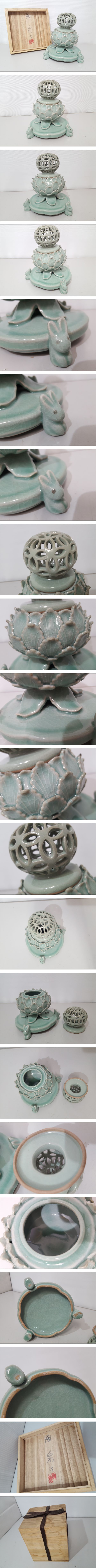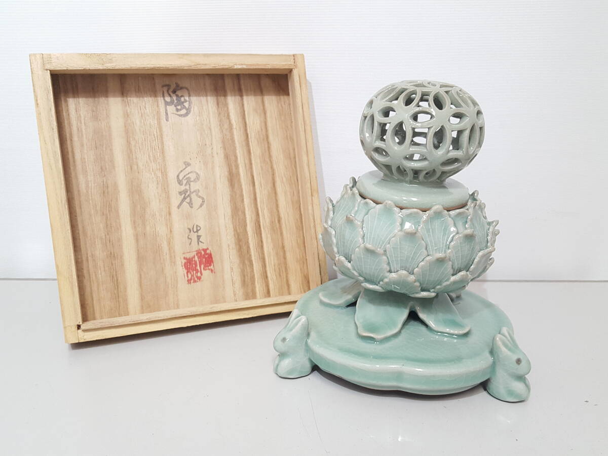 ※佐川急便の場合、離島など別途中継手数料がかかる地域が御座います。 その場合はお振込みを追加でお願いする場合が御座います事、 事前にご了承の程、宜しくお願い致します。 [商品名] 1円スタート 【うぶだし】陶泉 造 高麗青磁 蓮花透かし彫り 兎三つ足 香炉 [サイズ] 高さ約16cm, 横最大約14cm, 口径約4cm 重量約700g [素材] 陶器 [仕様] 箱付き(汚れが御座います) [状態] 若干の汚れが御座いますが、 その他は殆ど傷み無い美品です。