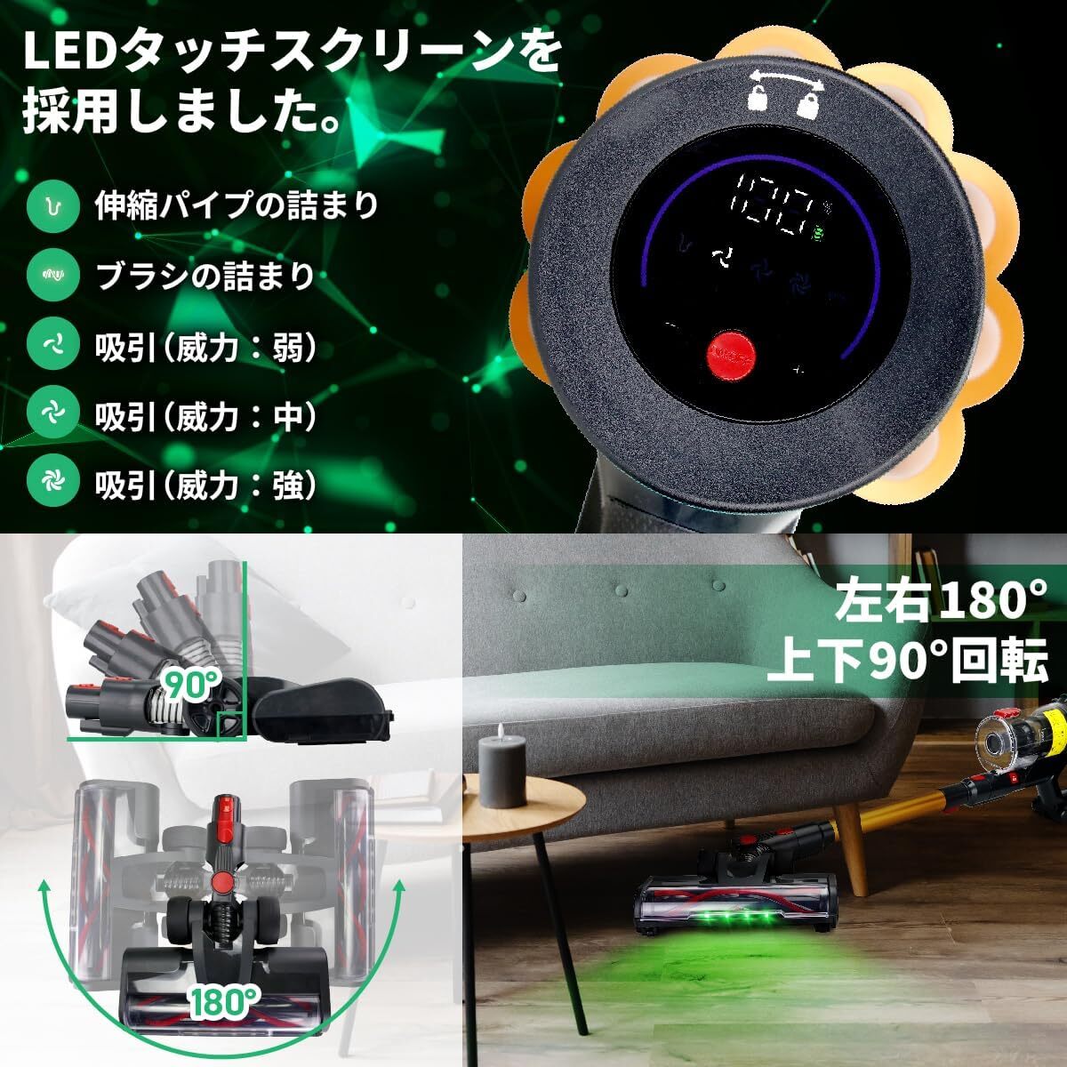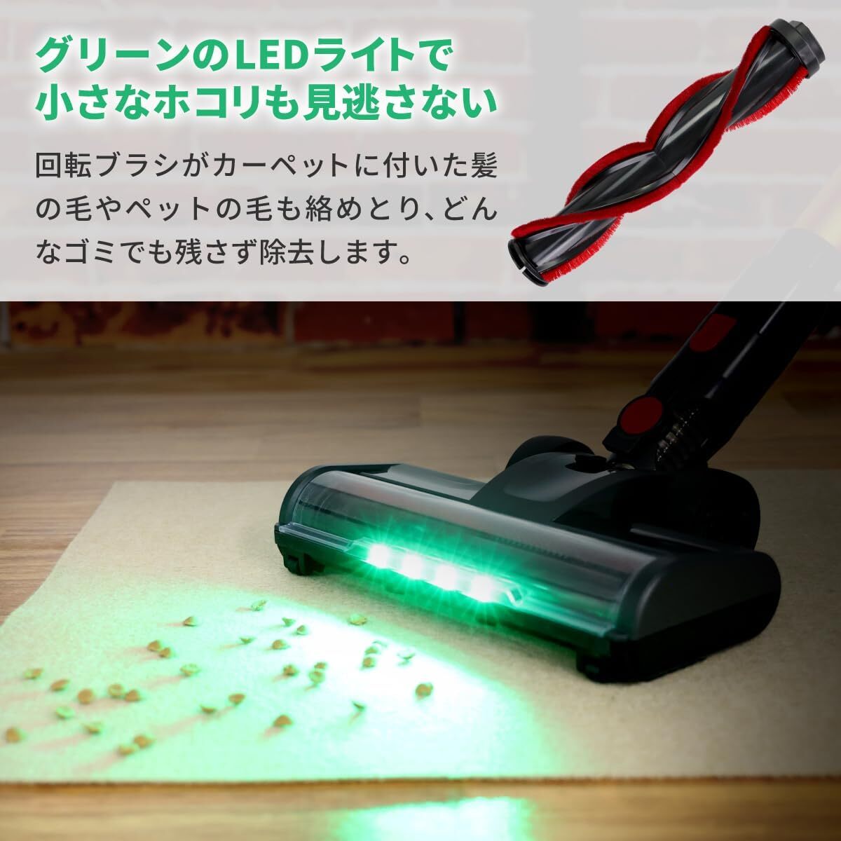 ●掃除場所によって付け替えられるアタッチメントを計3種ご用意致しました。ボタン1つで簡単に脱着できるシンプルな設計で老若男女問わずお使いいただけます。よくある掃除機に近いT字型のヘッドには先端部分にグリーンのLEDライトを搭載しており、明かりが届きにくい隙間や薄暗い箇所の掃除にもピッタリ!明かりに照らされることで、肉眼では見えにくい細かなゴミまで見えるので隅々まで掃除できます。
