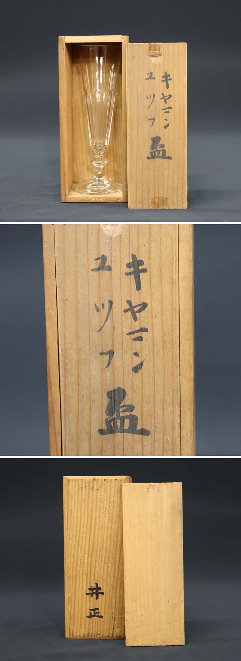 オリジナルの木箱の蓋表に【キヤマンコツフ(ギヤマンコップ)盃】の墨書があります。