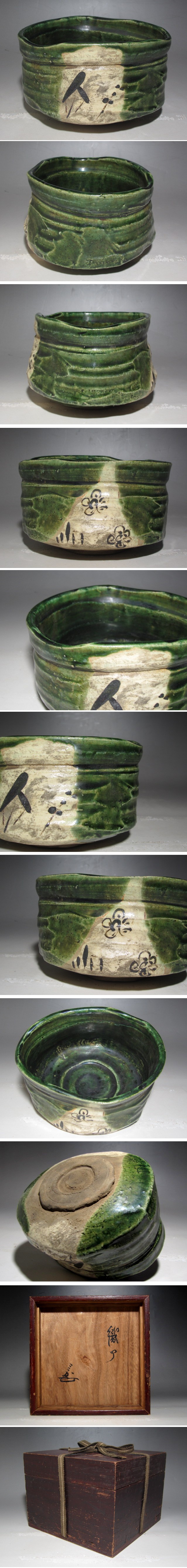 古織部茶碗です。 時代を感じる素晴らしい逸品です。 サイズ 直径15cm/高さ8.5cm(多少の誤差はお許しください) 状態 一見して疵やヒビ・直しは見られません。 骨董品という事をご勘案頂き、時代経過のスレや、小さな傷がある場合があるかもしれませんのでご承知置きください。 | |||