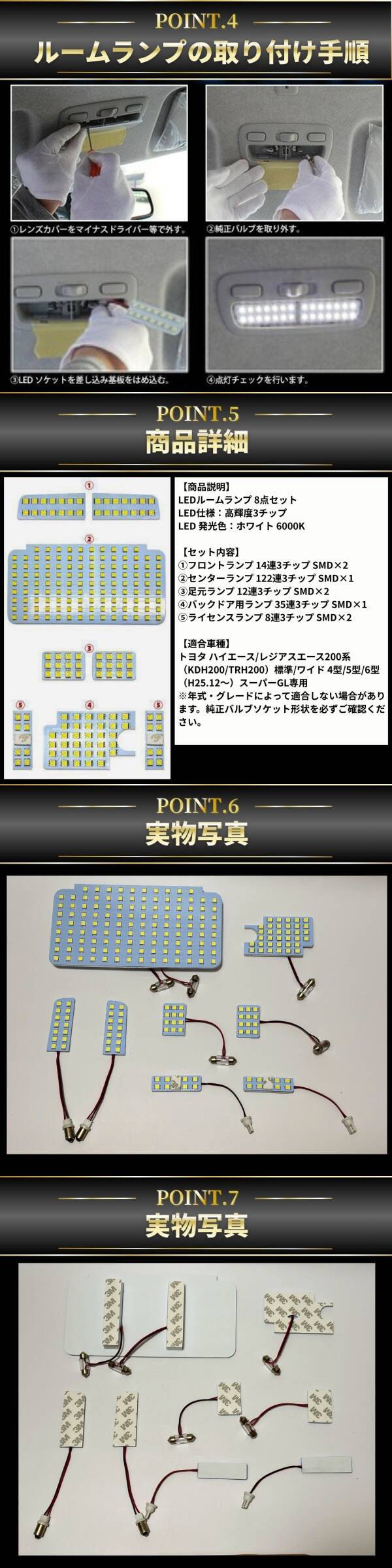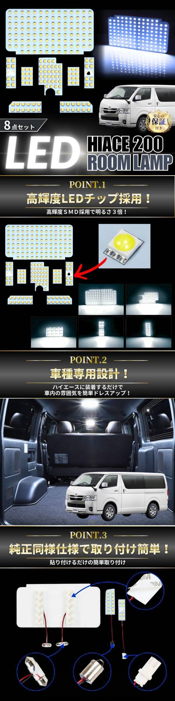 【製品仕様】 ・適合車種:トヨタ ハイエース/レジアスエース200系(KDH200/TRH200)標準/ワイド 4型/5型/6型(H25.12〜)スーパーGL専用 ※年式・グレードによって適合しない場合があります。純正バルブソケット形状を必ずご確認ください。 ・発光カラー:ホワイト(6000K) ・仕様:高輝度SMDチップ搭載、拡散性の高い明るさ 【セット内容】 ・フロントマップランプ:SMD14連 ×2 ・センターランプ:SMD122連 ×1 ・スライドドアランプ:SMD12連 ×2 ・最後部ランプ:SMD35連 ×1 ・ナンバーランプ:SMD8連 ×2 |