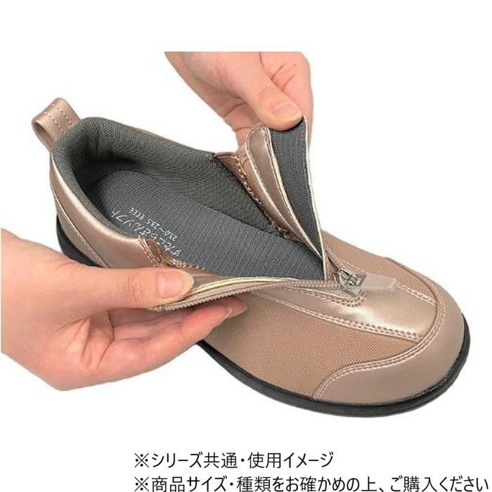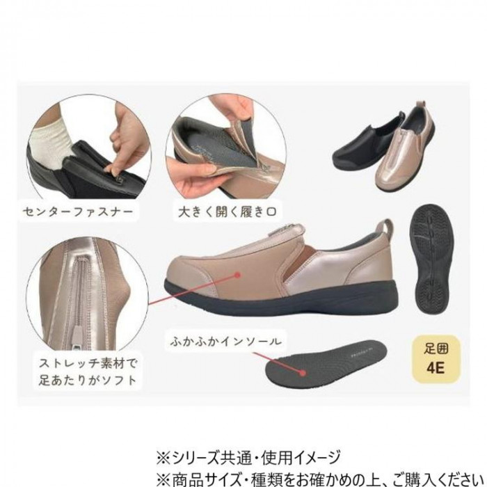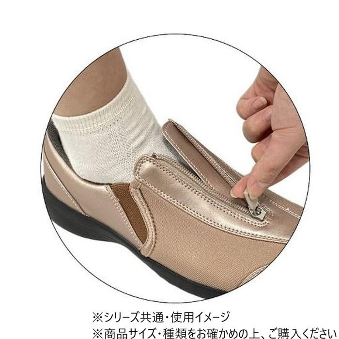 | 脱ぎ履きしやすいセンターファスナー式です。履き口サイドにゴム付きで、フィット感良く履けます。ストレッチ素材使用でやわらかな履き心地。外反母趾の方にもおすすめになっております。クッション性に優れたふかふかインソールを装備。軽く屈曲性に優れた靴底。 |