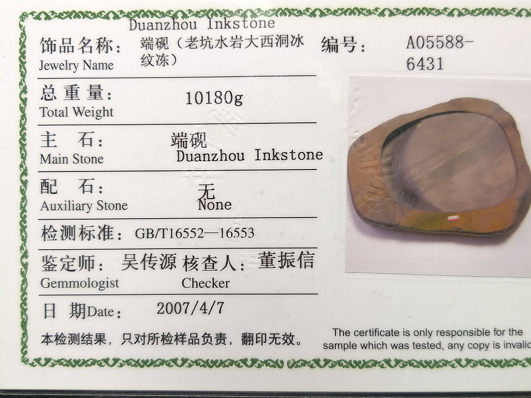 当方が出品の全ての端硯は皆、中国最高国家級鑑定機関において鑑定をしております。出品者の信用、名誉と、ご落札者の利益を保証するために、端硯偽物出品と見分けられるよう中国最高国家級鑑定証書をお付けいたしました。出品の端硯の品質は、お付けする中国最高国家級鑑定証書に基づき、弊社が保証いたします!