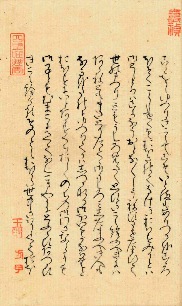 原文上部には「四望唯煙雲」《四望(しぼう)するも唯(ただ)煙雲(えんうん)のみ》という白楽天の漢詩の篆書印が押捺されている。漢詩の意味は、「あたりを眺めても靄(もや)と雲しか見えない」という意味。この漢詩は白楽天の「文集」の中の有名な一節です。紫式部が「薄雲」を書くに際し、「白楽天・漢詩集」の漢詩を熟読したうえで「源氏物語」の「薄雲の巻」を書いていることがわかります。この原詩の言葉の引用は、「薄雲の巻」に用いられていることで広く知られている。紫式部がこの原詩に親しんでいたことがわかる。