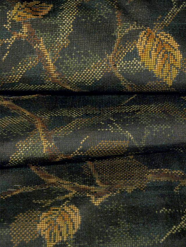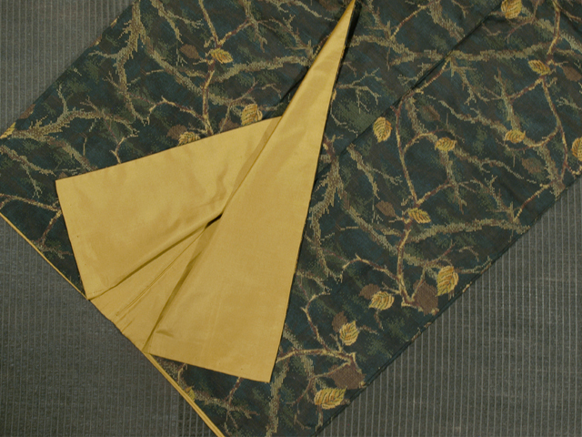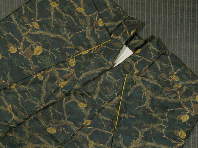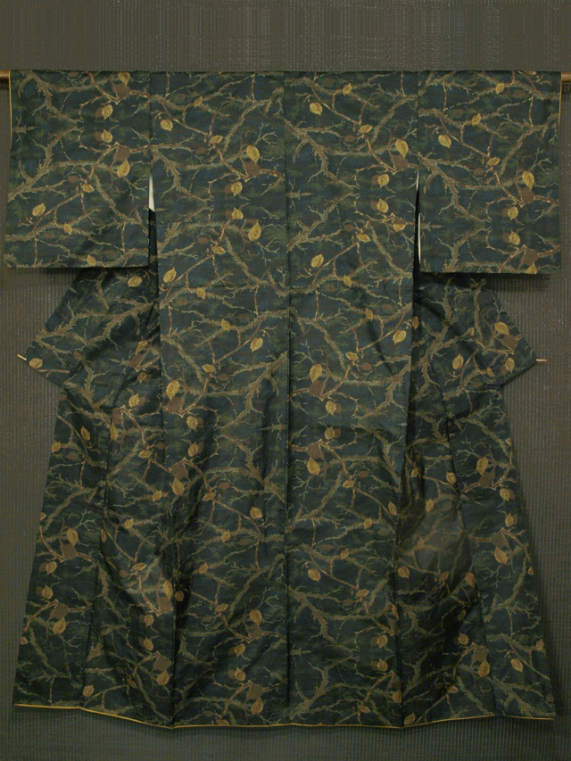 全体的な印象としては、濃淡のある深く沈んだ深緑色の地に、絣で枝葉の文様が織り込まれている、本場大島紬です。袷仕立てです。18 算(よみ)一元(ひともと)式の 9 マルキです。 落ち着きと渋みのあるさわやかなお色目で、帯合わせが楽しめる意匠です。大島紬のなかで最高峰の技術といえる、希少な 9 マルキの一元で、精緻で繊細な絣が素性の良さを物語っています。 ユーズド品です。生け洗いがされていてこよりが付いていますが、胴裏の胸脇などに直径約 15-20cm の薄めの黄変が広くあるほか、ところどころにもごくうっすらとしたこまかな黄変が 2、3 か所あります。表地はきれいな状態で、そのほかに目につくしみやよごれ、褪色などのダメージはないので、気にされない方であれば、お召しになれます。良いお品なので胴裏を張り替えても良いかもしれません。 |