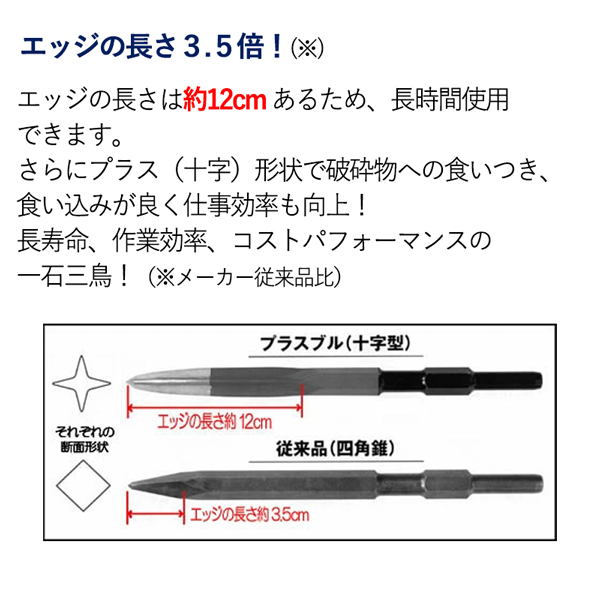エッジ断面がプラス(十字)形状で破砕物の食いつき、食い込みが良く、