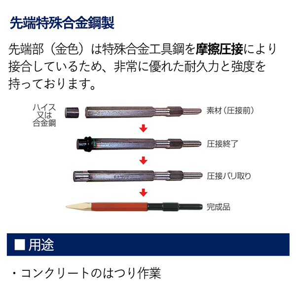 先端部(金色)は特殊合金工具鋼を摩擦圧接により接合してありますので、非常に優れた耐久性と強度を持っています。