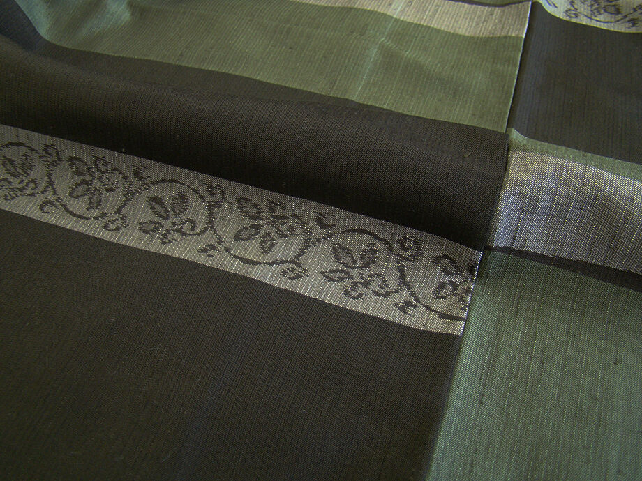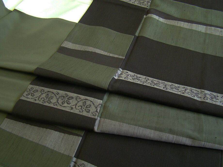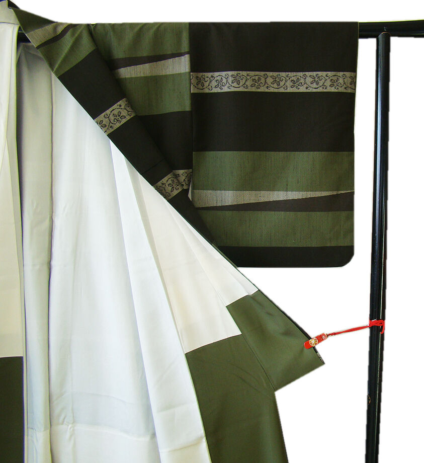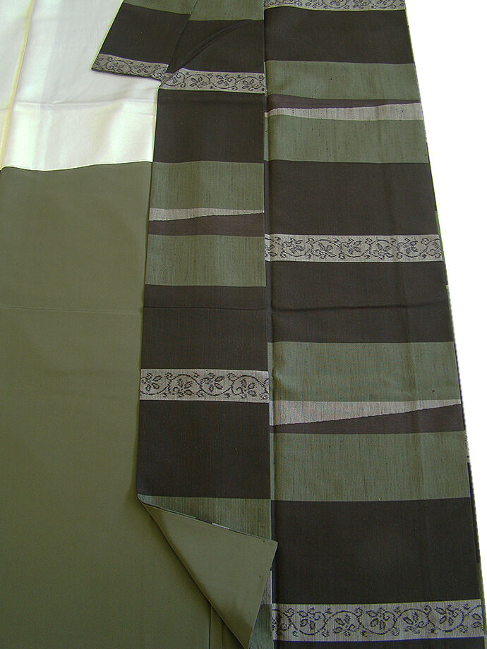 | 商品説明 | こちらのお品は「袷」ですので、10月から5月までお召し頂ければと思います。 十日町紬は着易く動きも軽く、着くずれしない腰の強さを併せ持った お洒落着としていつでもどこへでもお気軽にお愉しみ頂けご愛用頂けるお品です。 黒緑、老松色地にグレー色の横断に花草柄の織柄、 八掛は共色(正絹)、幅広い年代の方にお召頂け一枚あれば重宝致します。 |