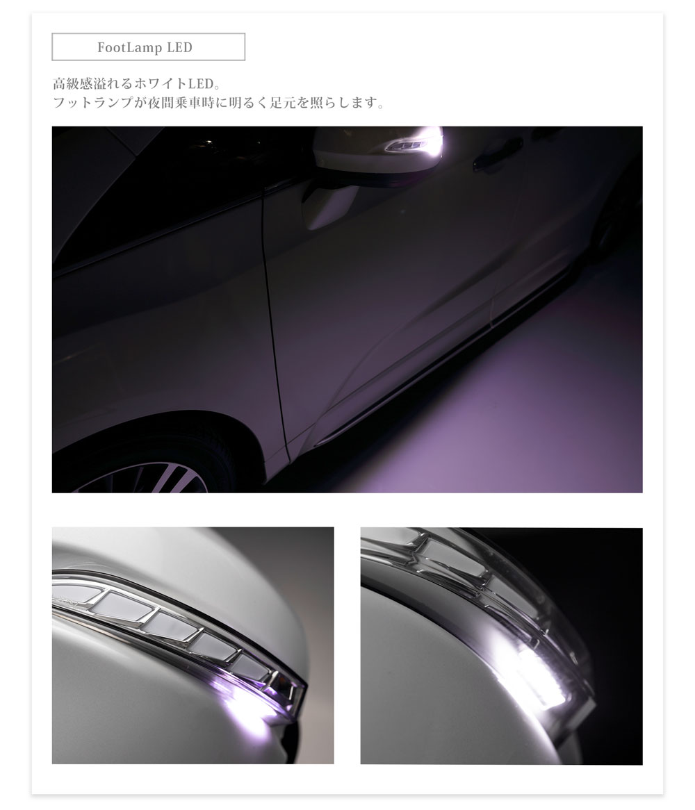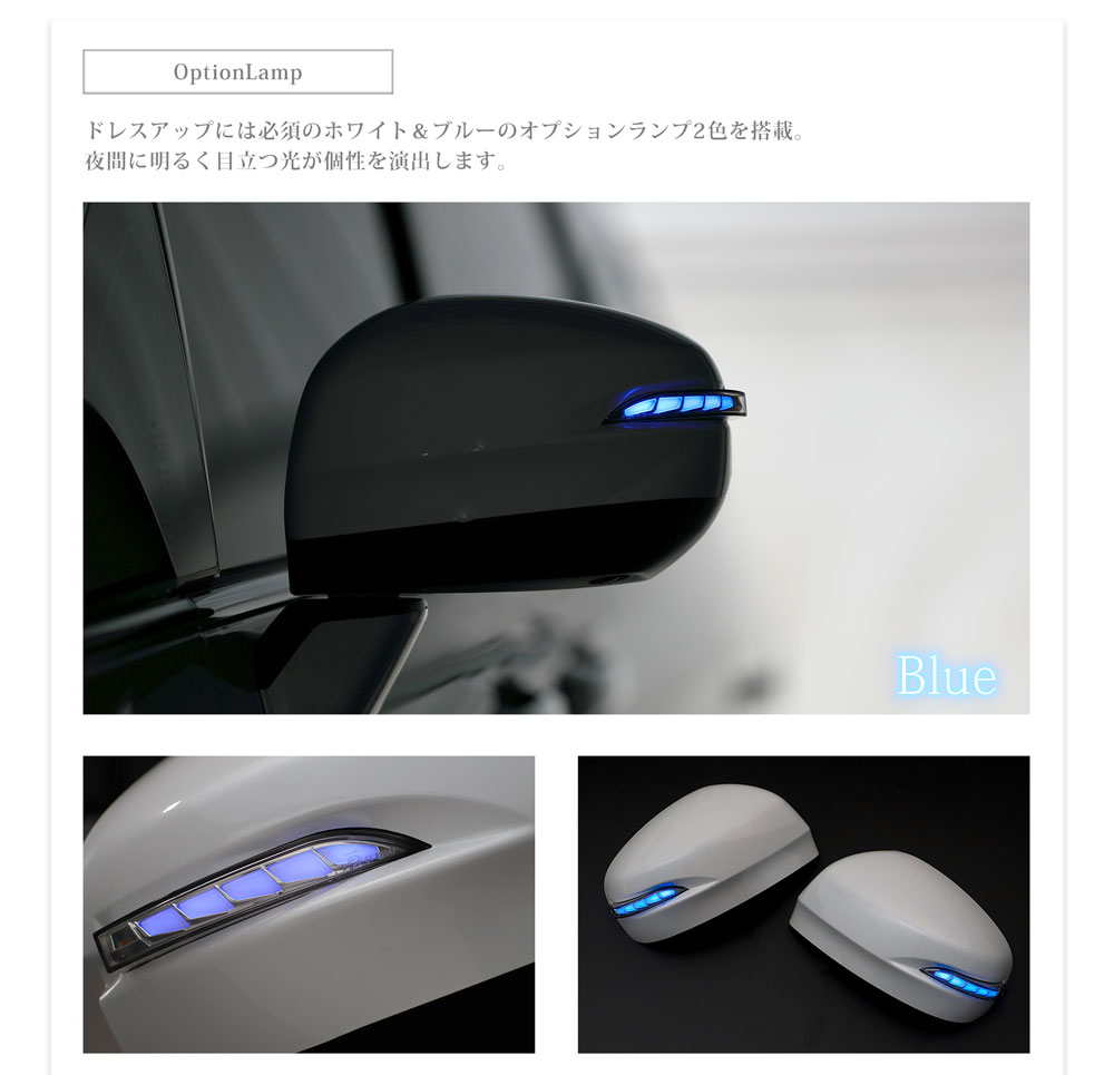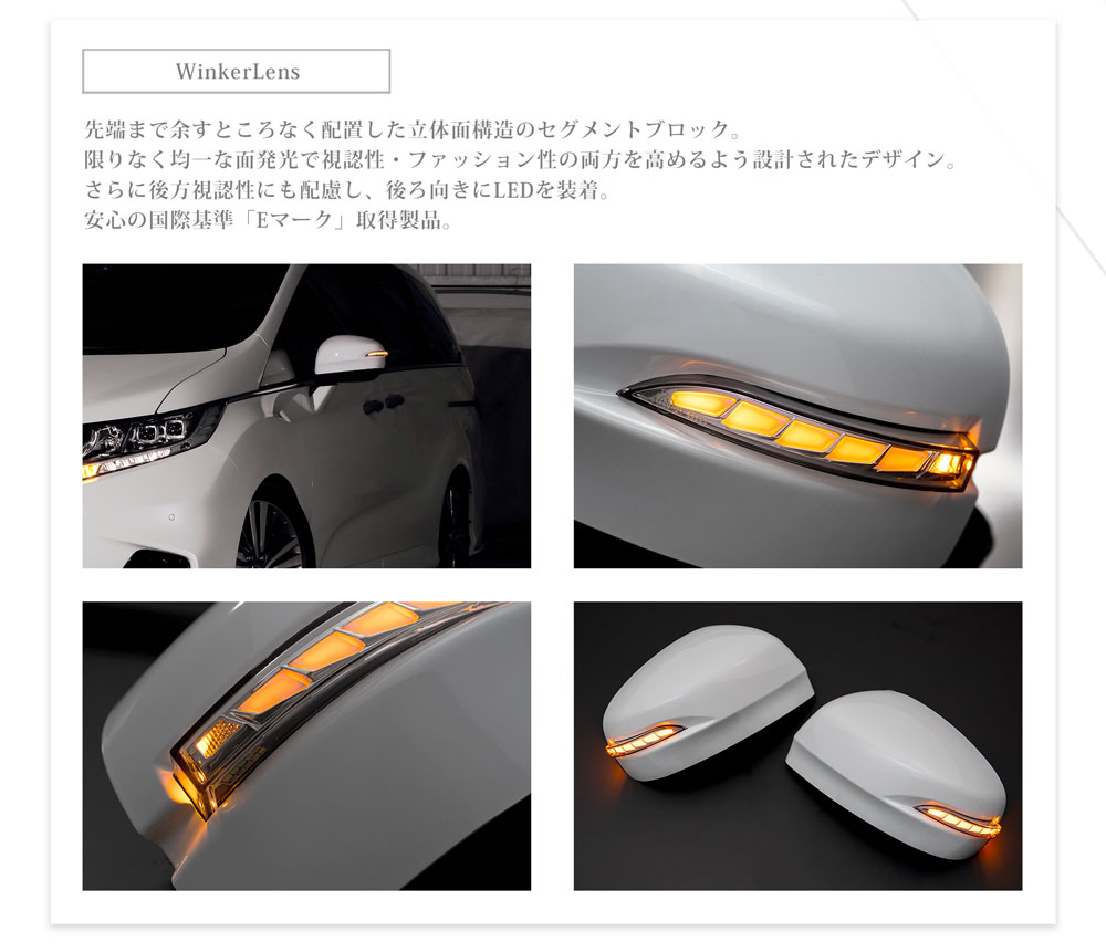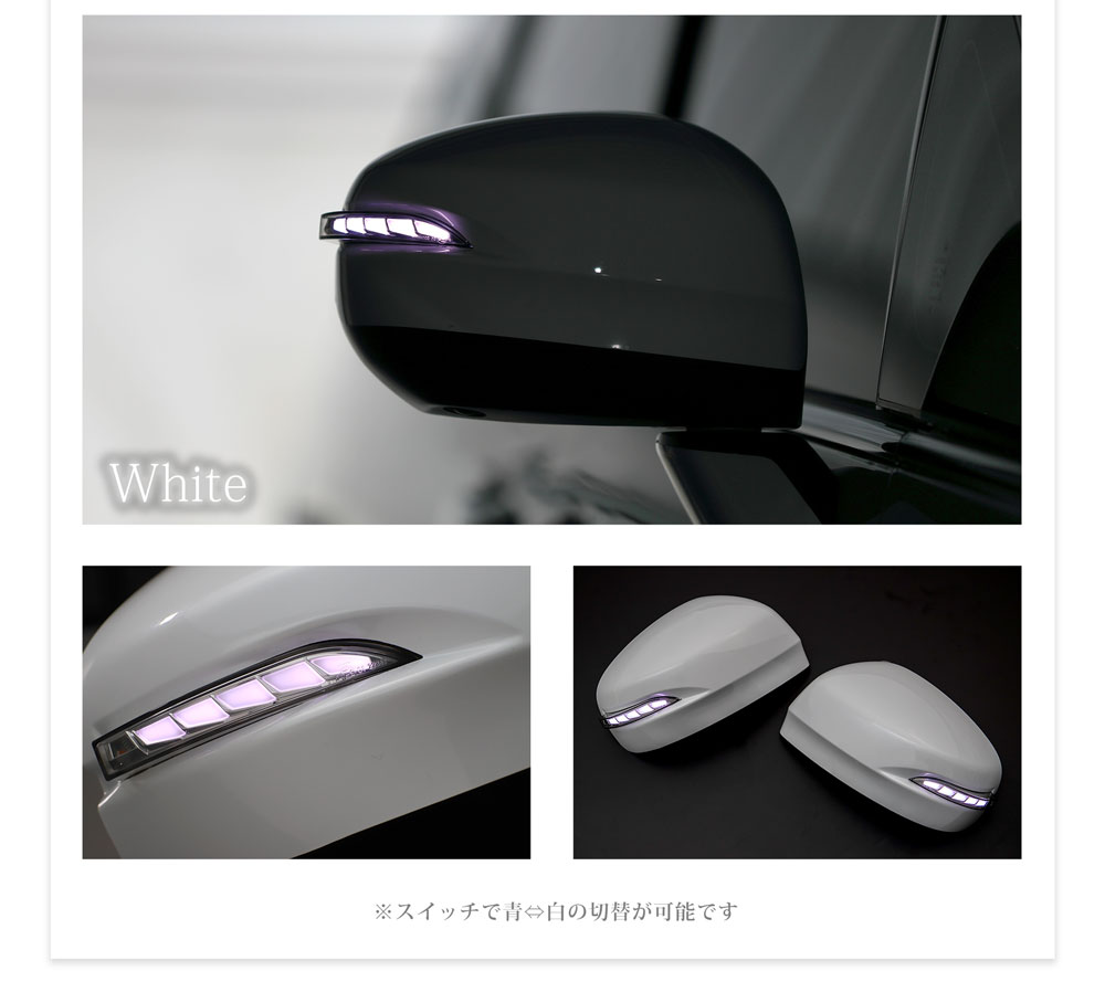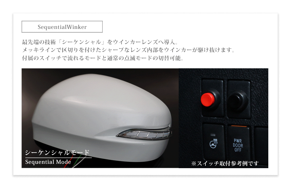 | 【流れるウィンカー「シーケンシャルモード搭載」】 ・ヘッドライト等に導入され、話題となったシーケンシャルウィンカーをドアミラーウィンカーにインストール! ・矢のようなレンズ内デザインに高級感溢れるメッキで区切りを付け、綺麗なシーケンシャルウィンカーを実現させました。 | |||||||||||||