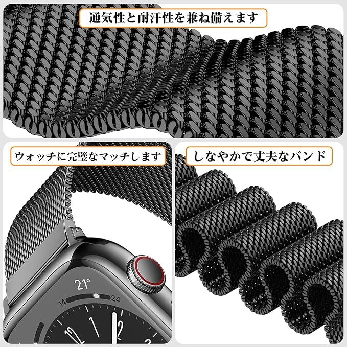 ご覧いただきありがとうございます。 商品名:Apple Watch用バンド 【この商品が品質で選ばれる理由】 高級ステンレス素材を採用し、通気性と耐久性を兼ね備えたApple Watch用バンドです。 ■こんな悩みありませんか? ・純正バンドのデザインが物足りなく感じることはありませんか? ・長時間の装着で手首が蒸れて不快になることはありませんか? ・シーンに合わせて上品に使えるバンドを探していませんか? ★こんな時におすすめ! ・ビジネスシーンやフォーマルな場面で高級感を演出したいとき ・汗をかきやすい季節でも快適に着用したいとき ・男女兼用でおしゃれなApple Watch用バンドを探しているとき ------------------------------------- 【対応機種】 ・Apple Watch Series Ultra / Ultra 2 / 10 / 9 / 8 / 7 / 6 / SE / 5 / 4 / 3 / 2 / 1 に対応 ・49mm / 46mm / 45mm / 44mm / 42mm / 41mm / 40mm / 38mm のサイズに対応 【デザインと装着感】 ・精巧に磨かれたステンレス素材で高級感があり、幅広いシーンで活躍します。 ・マグネット式バックルで工具不要、簡単に長さを調整でき、しっかりと装着できます。 【通気性と耐久性】 ・メッシュ構造により通気性が高く、蒸れにくく快適に使用できます。 ・ステンレス素材は丈夫で長持ちし、日常使いでも安心です。 ご不明な点などございましたら お気軽に「質問する」からお問い合わせください。 |