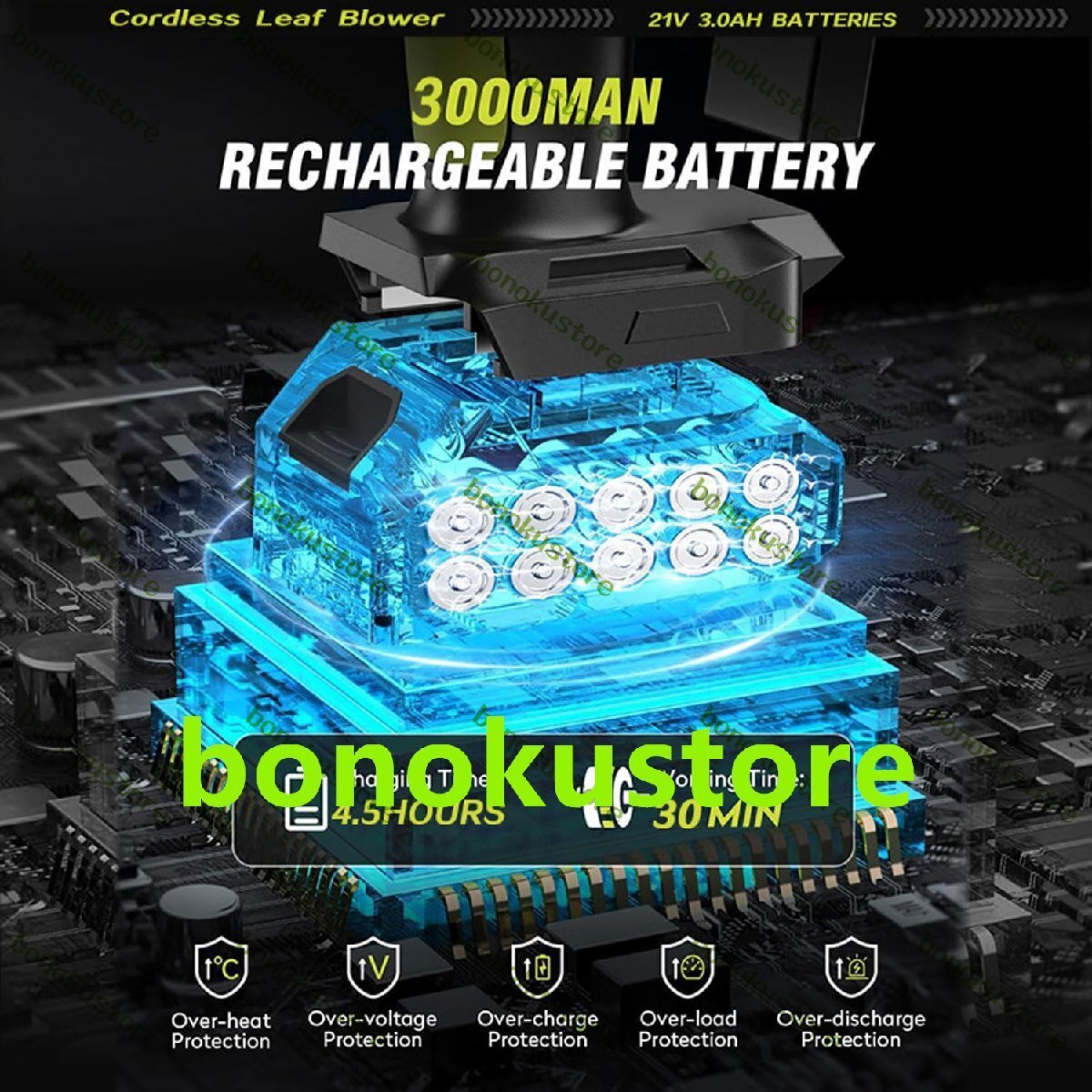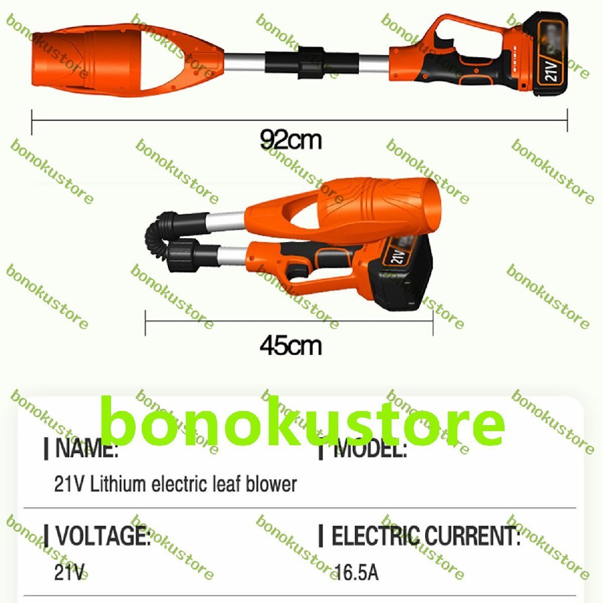 名前: リチウム電池リーフブロワー 電圧: 21V 電流: 16.5A バッテリー容量: 10C3000MAH 充電時間: 4.5 時間 モーター速度: 29000r/分 最大電力: 400W 最大風速:63m/s 風力: 720g