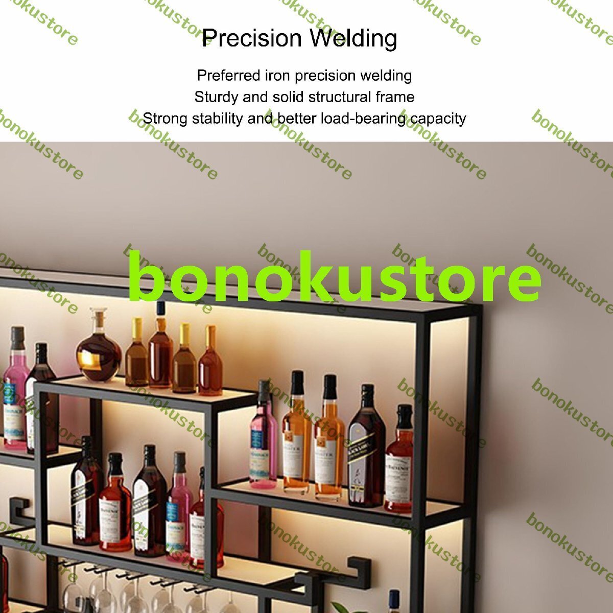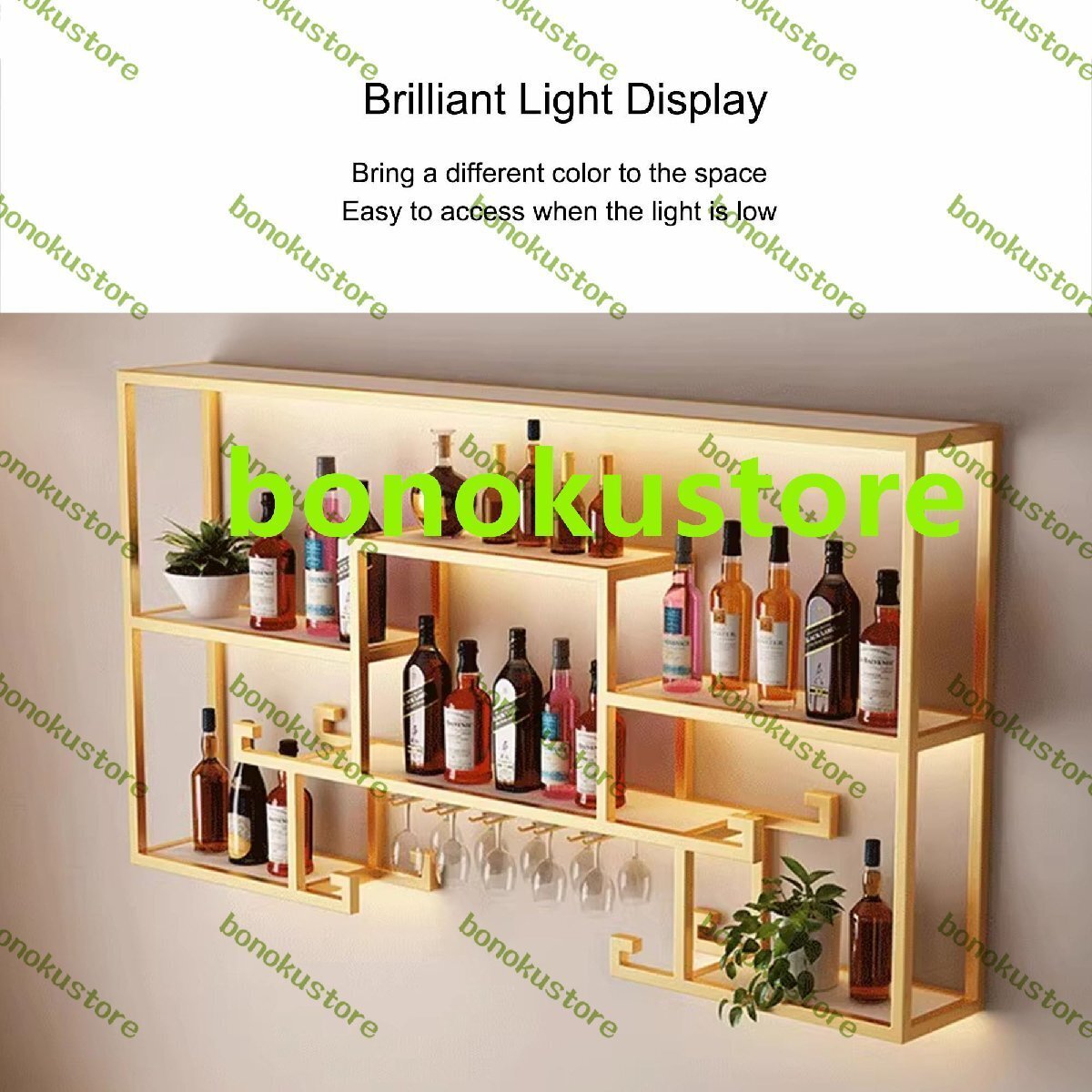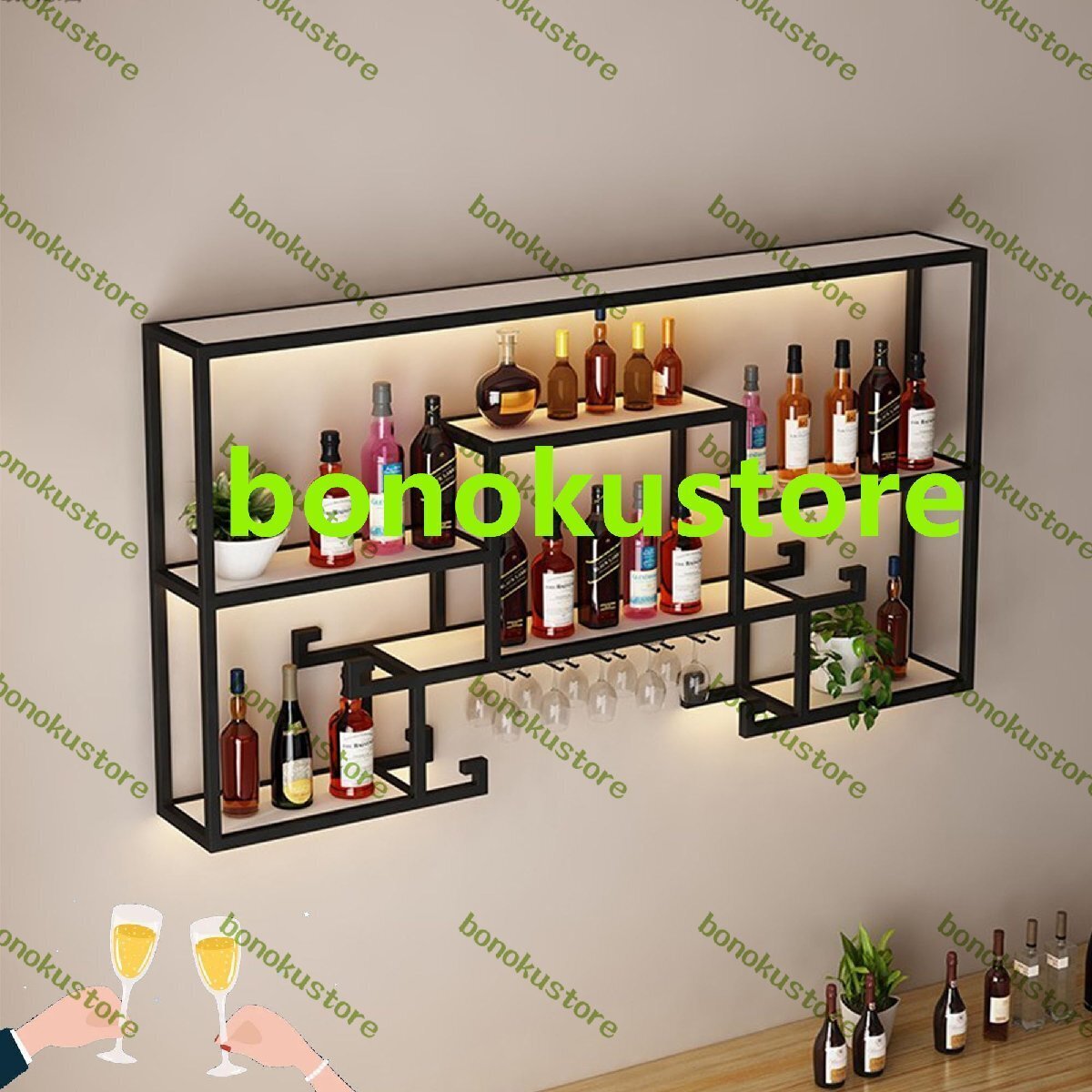 ボトルラック メタルワインラック バーシェルフ 壁掛け式 吊り下げ式ワイングラスホルダーラックとLEDライト付き 酒瓶ディスプレイ棚ラック カウンタートップフローティングバー ミニバーキャビネット ホームバー用