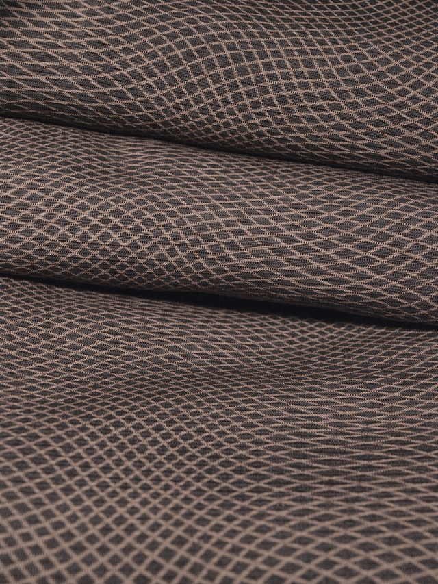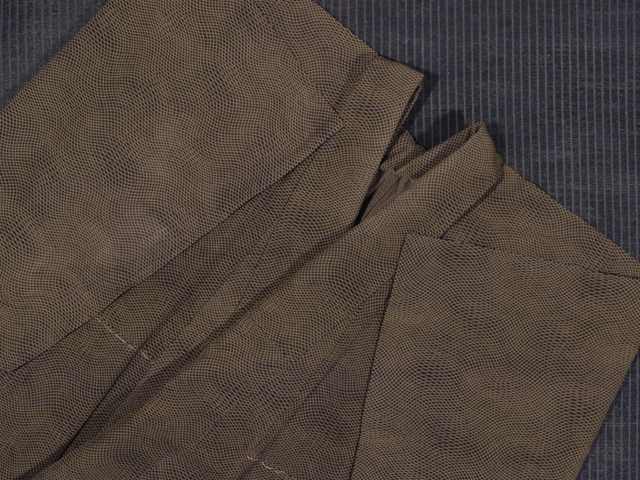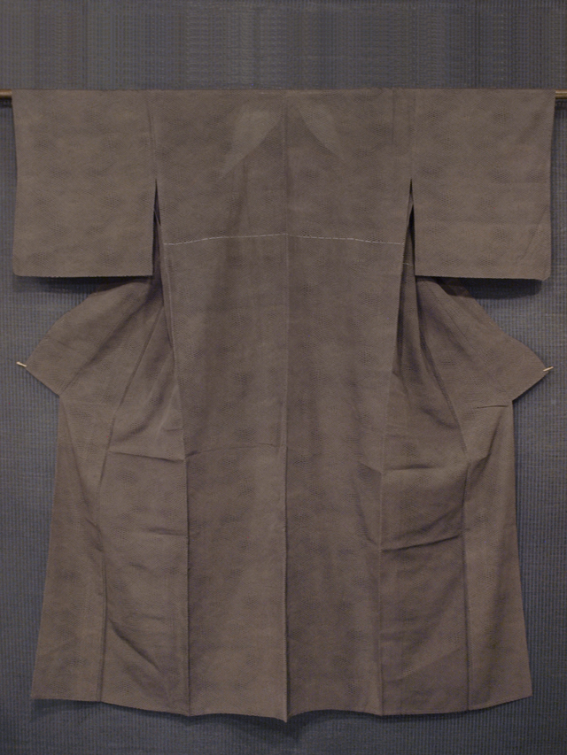 詳細  黒茶色の地に、土色で抽象的な曲線の文様が染められている、三本絽の小紋です。単衣仕立てです。夏着物です。
