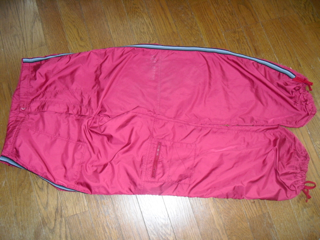 サイズM、ポリエステル100%です。平置きでウエスト38センチ、股下73センチ位です。画像にありますように、プリントが薄くなっていますが、他は特に問題ありません。