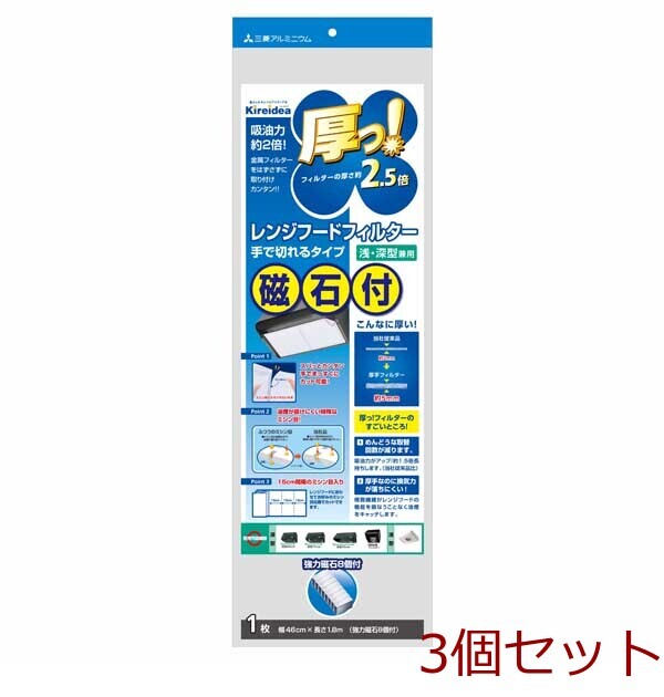 換気扇・レンジフードの汚れ防止に! レンジフードに取付、毎日少しずつ積み重なる汚れをしっかり受け止めて、レンジフードの汚れを防止します。 厚手のフィルターが細かい油分までしっかりキャッチ!お掃除が大変なレンジフードのキレイをキープします。 15cmごとの特殊なミシン目でハサミを使わずキレイにカットできます。 生産地 : 日本 サイズ : 1枚 タテ:460 ヨコ:1800mm 60cm幅レンジフードで3回分です。 1枚入+取付磁石8個付 素材 : 難燃性不織布 注意事項 : ※デザインは変更になる場合がございます。ご了承ください。 ブランド : 三菱アルミニウム |