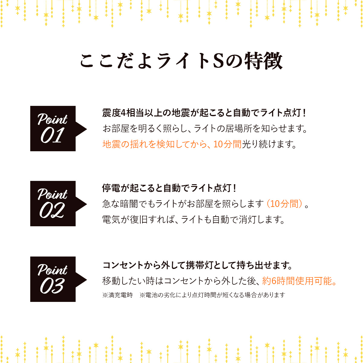 | 説明 | 防災備蓄ライト、pioma ここだよライトSです。<brここだよライトSは、地震が起きた時、停電が起きた時に10分間自動点灯。コンセントを外しても携帯灯として約6時間お使いいただけます。<br>消灯後も30秒間、ライトを点灯させることもできます。<br>ライトは充電式なので、日頃からコンセントに挿しておけば、電池切れの心配がありません。<br>シンプルなデザインなのでお部屋の景観を損ねることなく、どのお部屋にもマッチします。<br><br>■サイズ:W62×H96×D32mm(突起部を除く)■定格電圧:AC100V 50/60Hz ■消費電力:0.4W(充電時間:約48時間) ■内蔵電池:ニッケル水素充電池(2.4V 650mAh) ■点灯震度:4相当以上 ■点灯時間:地震時/約10分、停電時/約10分、消灯後の足元灯/約30秒、携帯灯/約6時間(満充電時) ■使用温度範囲:0度から40度 ■製造:日本製 |