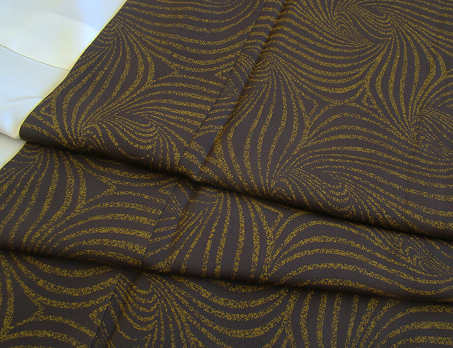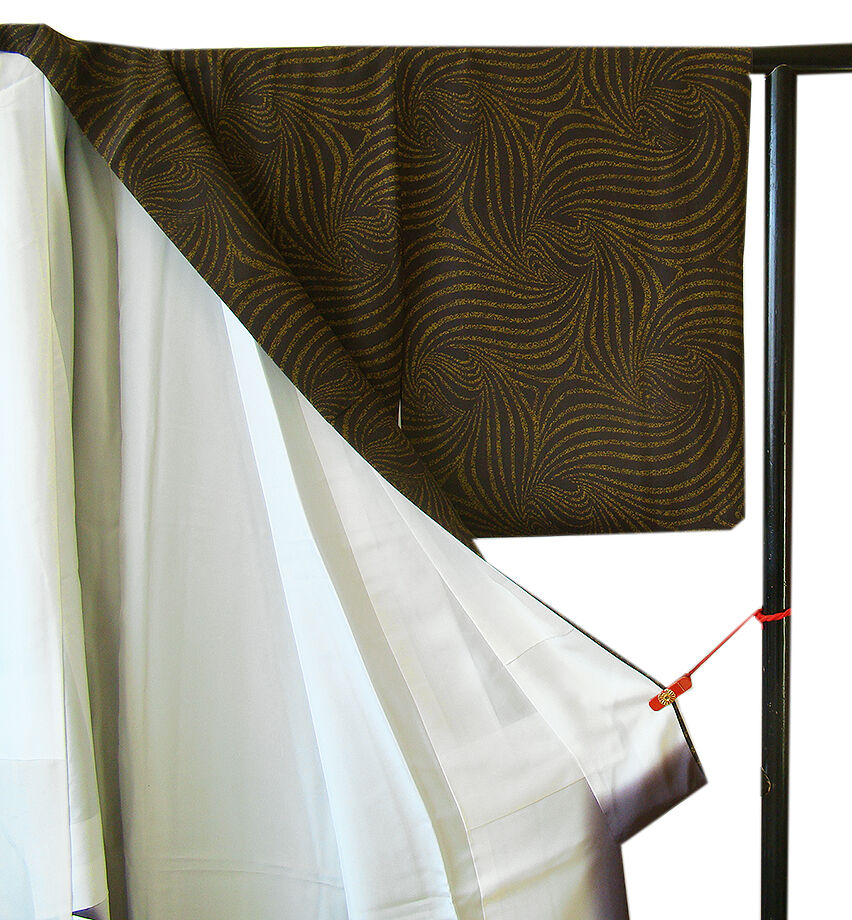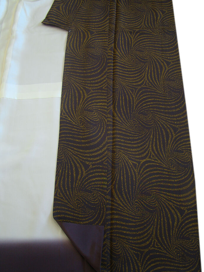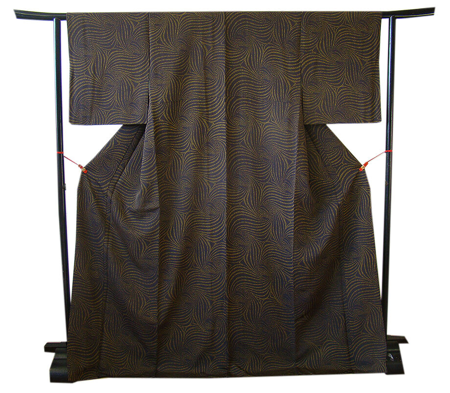 商品説明 | こちらのお品は「袷」ですので10月から5月までお召頂ければと思います。 とてもしなやかなさらりとした手触りの着心地良い重めの極上ちりめん地の生地、 渋い黒橡色地に梅幸茶色の染柄、 八掛は滅紫色(正絹)、幅広い年代の方にお召頂けます。 |