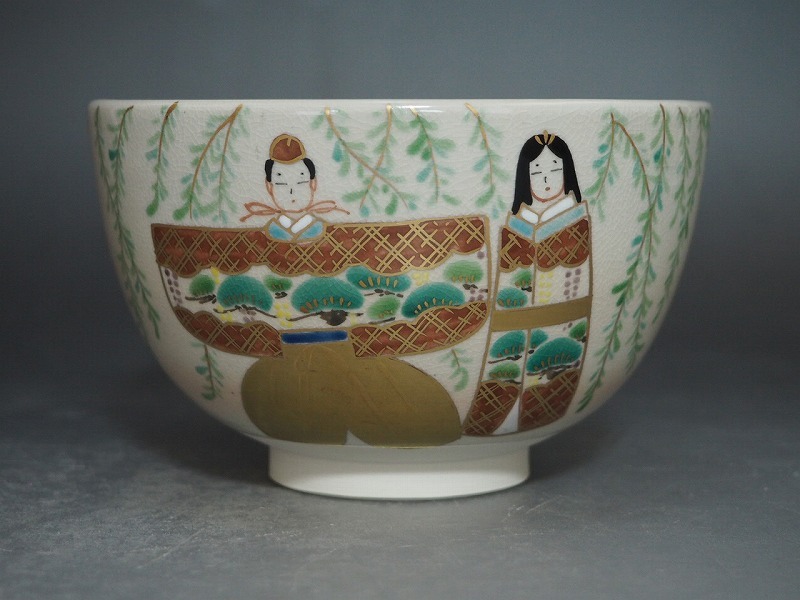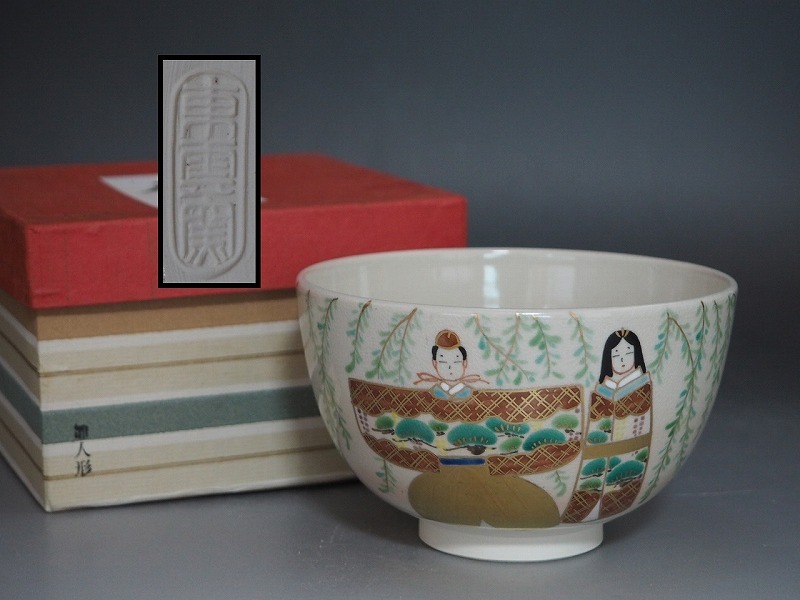 | A4480 京焼 東雲窯 造 雛人形 茶碗 化粧箱付 ☆ 茶道具 抹茶器 茶懐石 茶事 茶の湯 抹茶碗 立雛 陶器 作家物 在銘 陶印 美品 良品 無傷 | ||