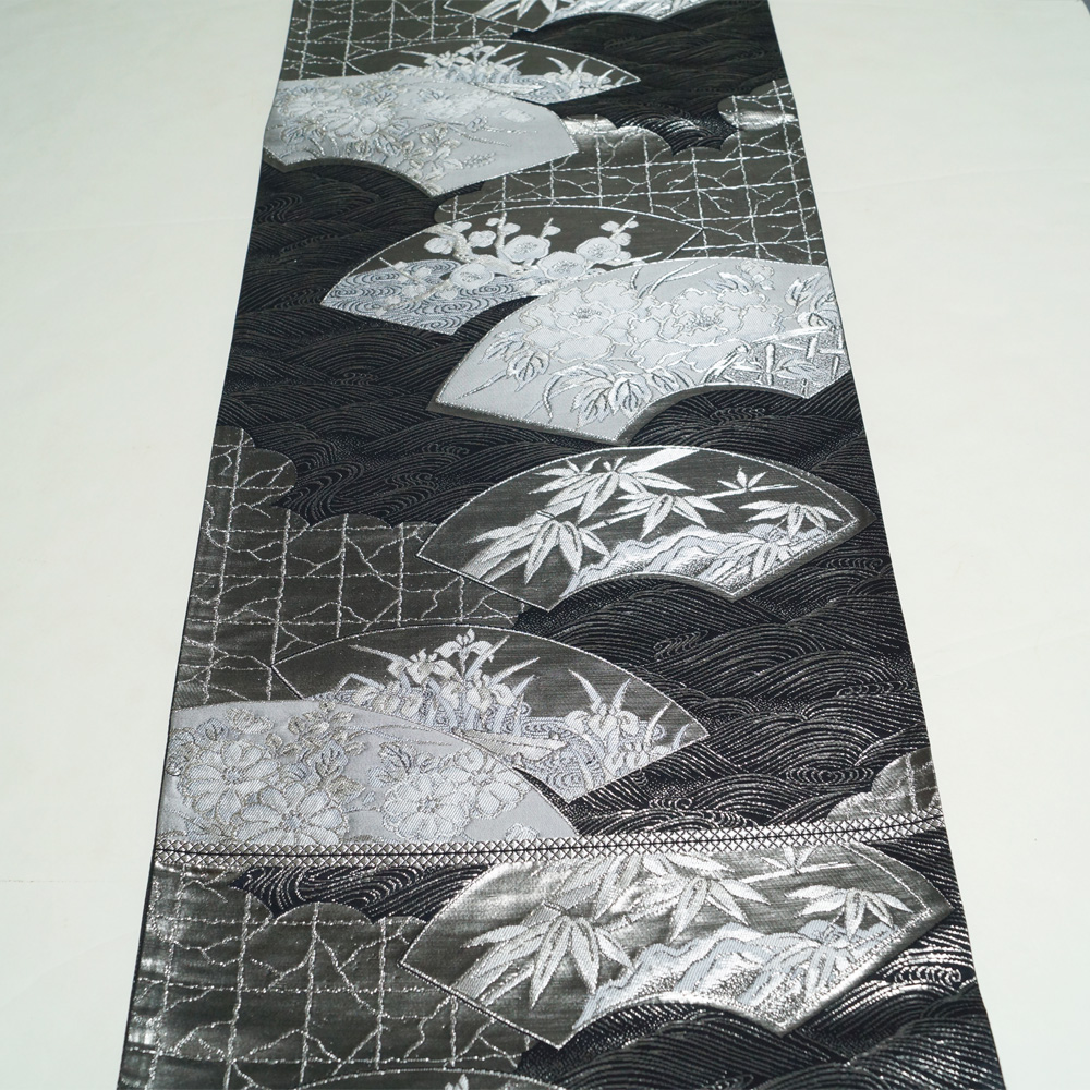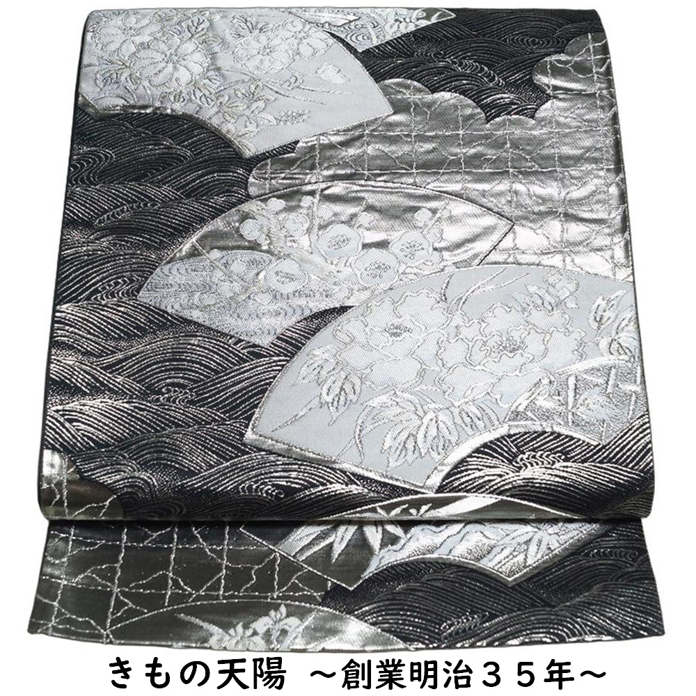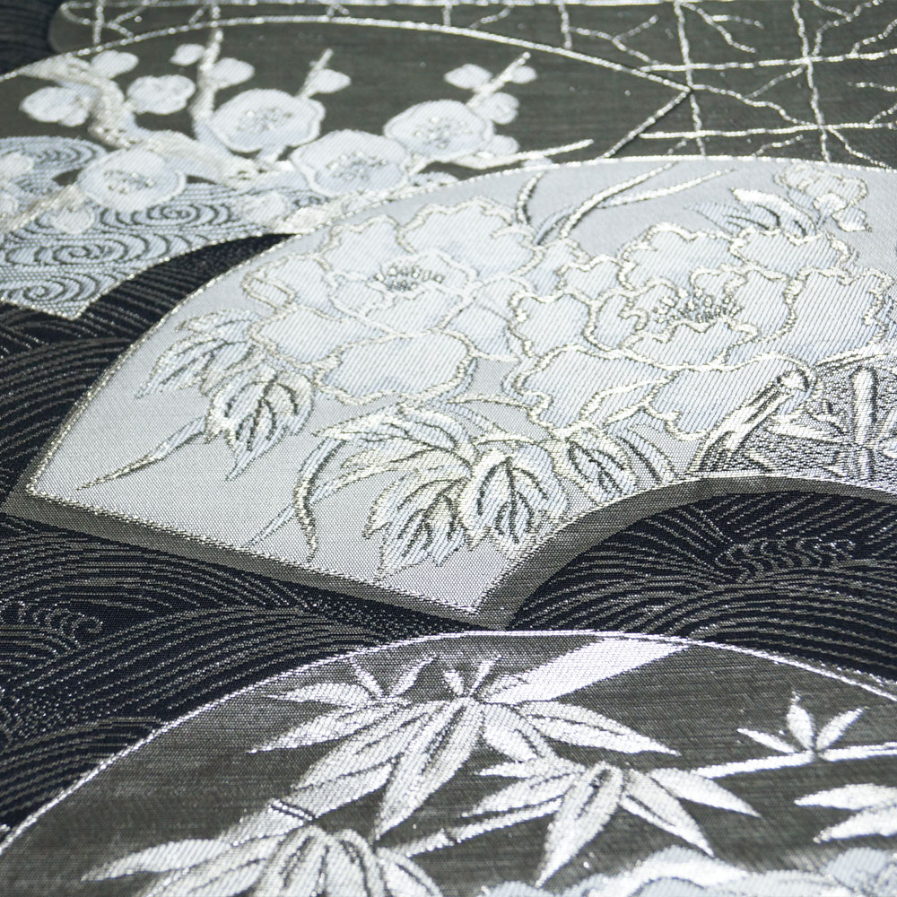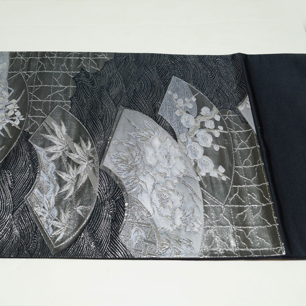 | 商品 説明 | 黒色系の地に銀糸の地紙に波頭、雲取、梅、牡丹などの模様が織られた袋帯です。 |