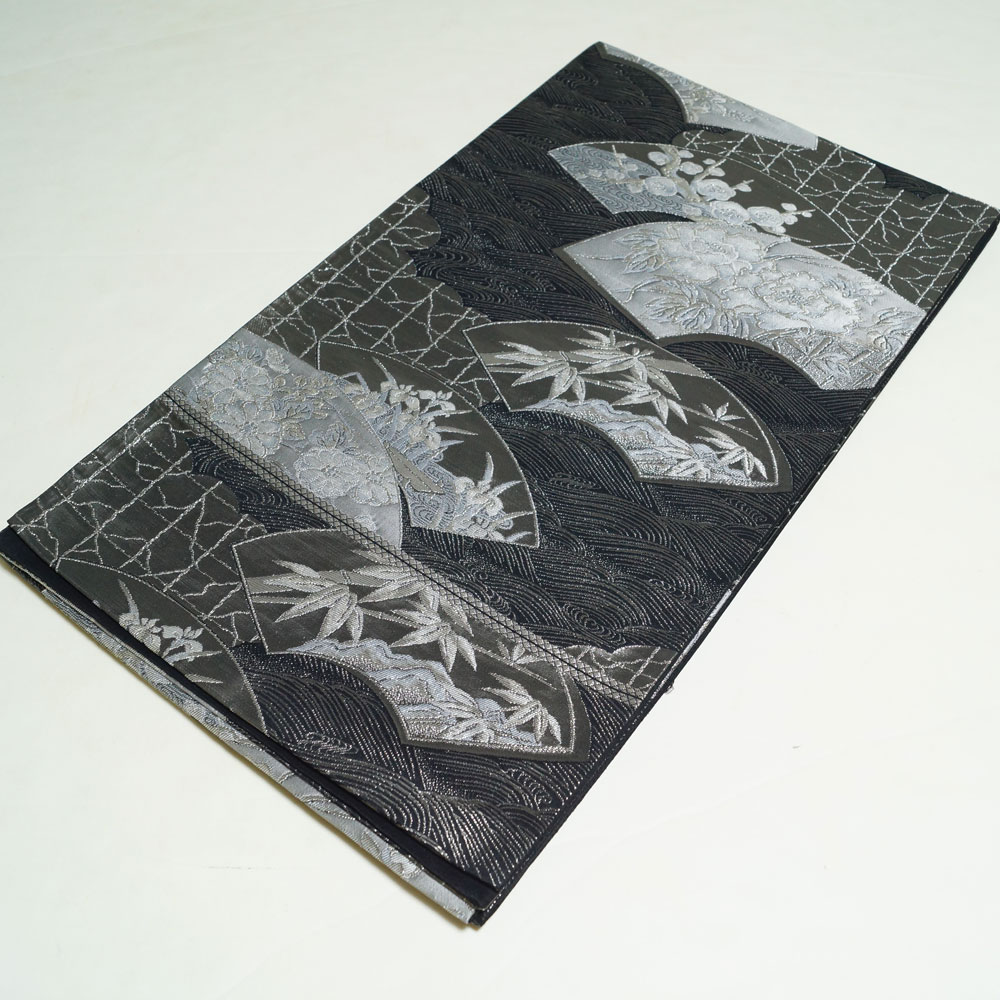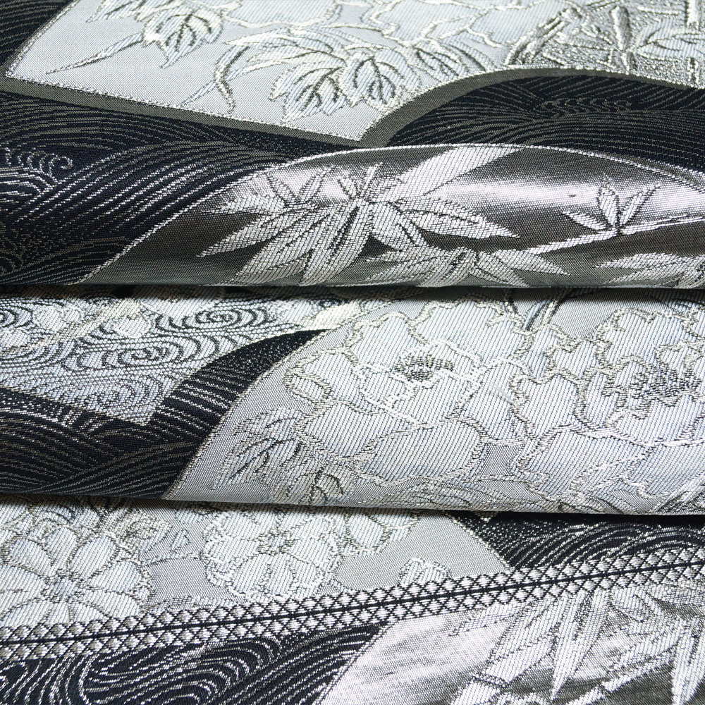 | 品 名 | 袋帯 地紙に波頭、春秋模様 銀糸 六通柄 黒色系 【袋帯 中古 袋帯 リサイクル 袋帯 フォーマル 袋帯 リサイクル着物 帯 正絹 袋帯 モダン 着物 袋帯 中古】 | ||