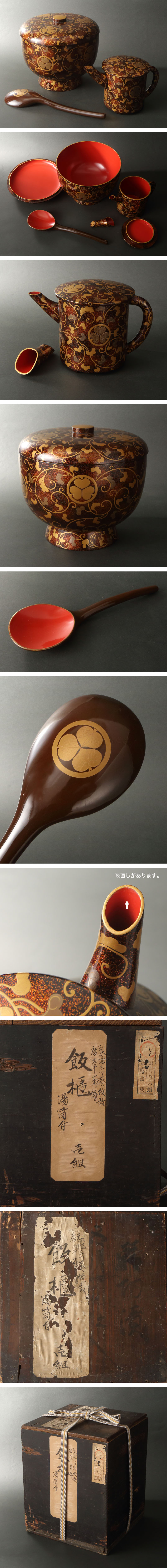 江戸後期の飯器です。 十三蘂の葵御紋が可憐な唐草文様とともに金蒔絵されております。十三蘂の葵紋は家重~家治期より将軍家の紋章として用いられるようになりました。 将軍家の威信を懸け、豪奢な蒔絵がふんだんに用いられた逸品です。 付属:識箱が付属します。 寸法:飯器:高さ19.5cm、幅22.5cm、湯桶:高さ12cm、幅10.5cm、杓文字:長さ28.5cm(最大幅。若干の誤差はご了承下さい) 状態:経年感、漆ハゲ、わずかなアタリ、細かなキズ、湯桶の口に直しがございます。 |