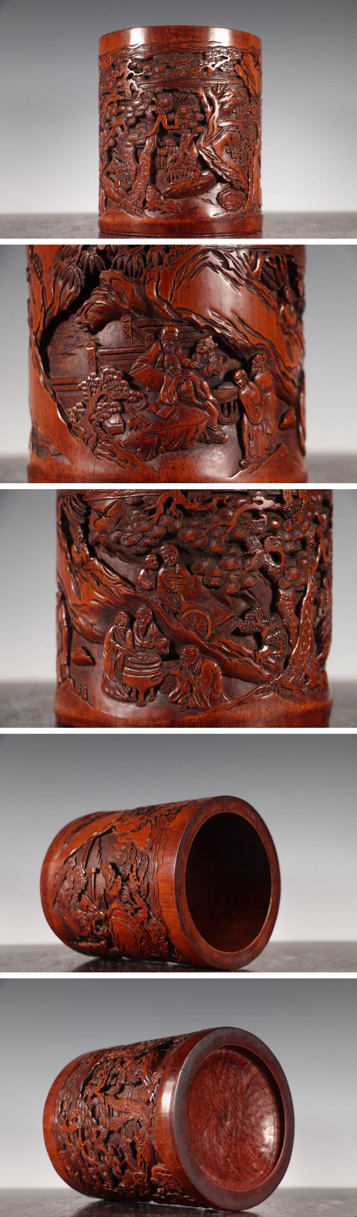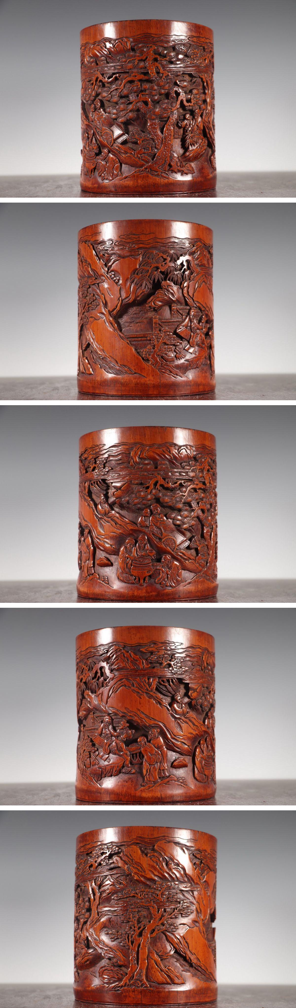 【清】某有名オークション購入 清時代 古竹彫り 山水人物紋筆筒 当時物保証 古置物 古擺件 古美術 時代コレクション7L10-ES15